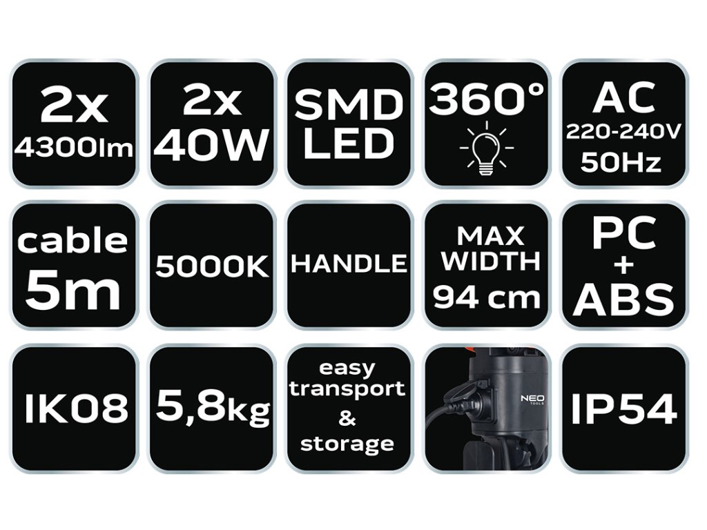 360-stupňová dvojitá lampa 2 x 4300 lm 99-099 od spoločnosti NEO s výkonom 2x 40 W má skladací dizajn do maximálnej výšky 2 m a šírky 94 cm. Má maximálne 180-stupňové rozloženie svetla. Zariadenie je vybavené elektrickou zásuvkou pre maximálny odber 3580 W 16 A. Má farbu svetla 5000 K a napájanie striedavým prúdom 220 - 240 V 50 Hz. Je možné zapnúť iba 1 žiarovku. Svetlo je intenzívne, ale nie oslňujúce, a preto prispieva k vysokej úrovni pracovného komfortu. Lampa má 5 m kábel, rukoväť na prenášanie a magnety v základni a lampách na jednoduchú prepravu. Hmotnosť zariadenia je len 5,8 kg. Telo je vyrobené z ABS a má stupeň vodotesnosti IP 54, ako aj odolnosť proti pádu a rozdrveniu IK08. Dvojitá lampa NEO sa odporúča pre domácich majstrov a staviteľov.