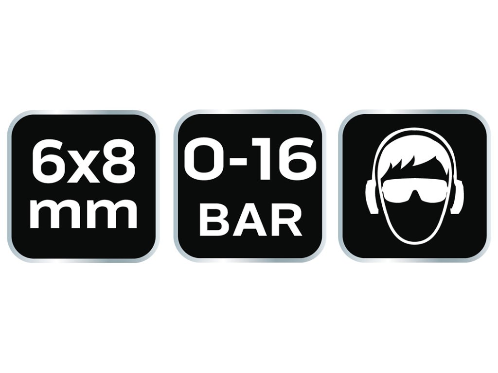 Rýchlospojka pre kompresor s výstupom pre hadicu 6 x 8 mm, nehrdzavejúca oceľ, mosadz, s pružinou, maximálny tlak 16 barov, CE