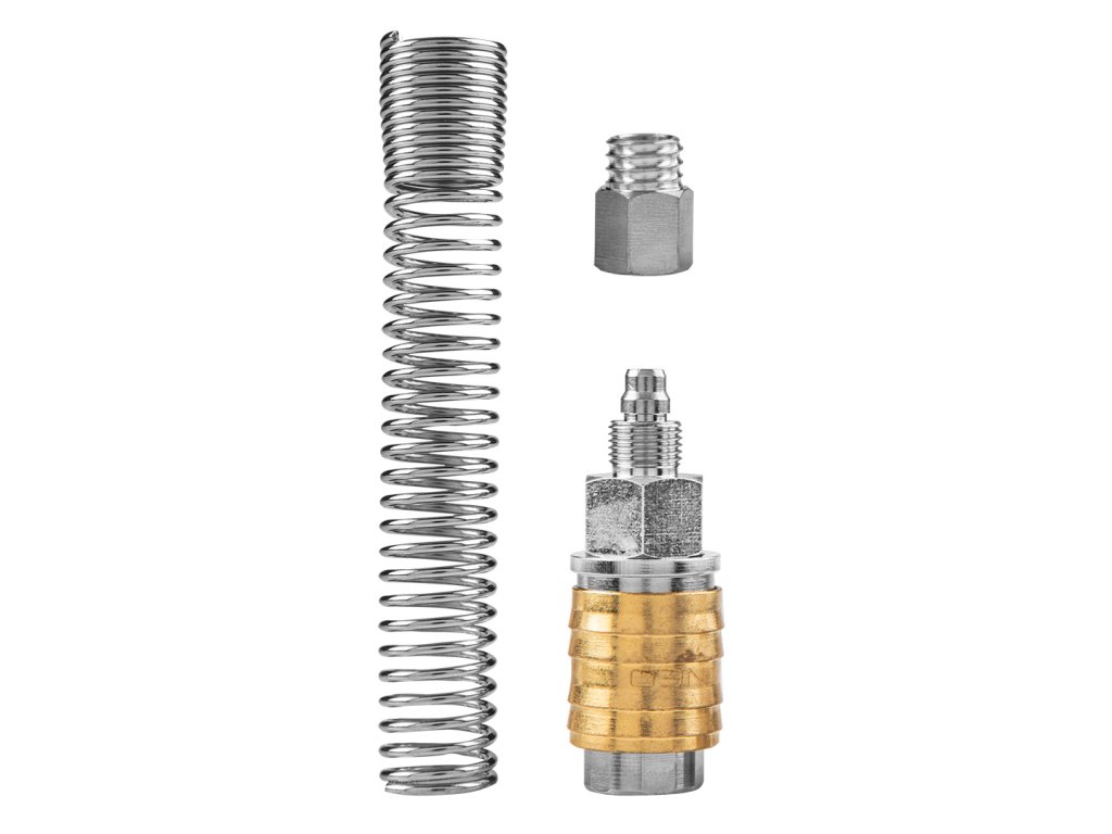 Rýchlospojka pre kompresor NEO (ref. 12-602) s hadicovým výstupom, vyrobená z vysoko kvalitnej nehrdzavejúcej ocele a mosadze. Vonkajší priemer 10 mm, vnútorný priemer 8 mm. Zabezpečuje bezpečné pripojenie pri tlaku do 16 barov. Vďaka pružine sa tlaková hadica jemne prehýba a nezhŕňa sa hneď za armatúrou. Vysokú kvalitu výrobku potvrdzuje certifikát CE. Značka NEO spĺňa očakávania profesionálov.