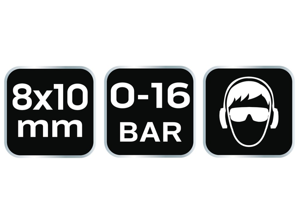 Kompresorová hadicová spojka s výstupom pre hadicu 8 x 10 mm, nerezová oceľ, mosadz, s pružinou, maximálny tlak 16 barov, CE