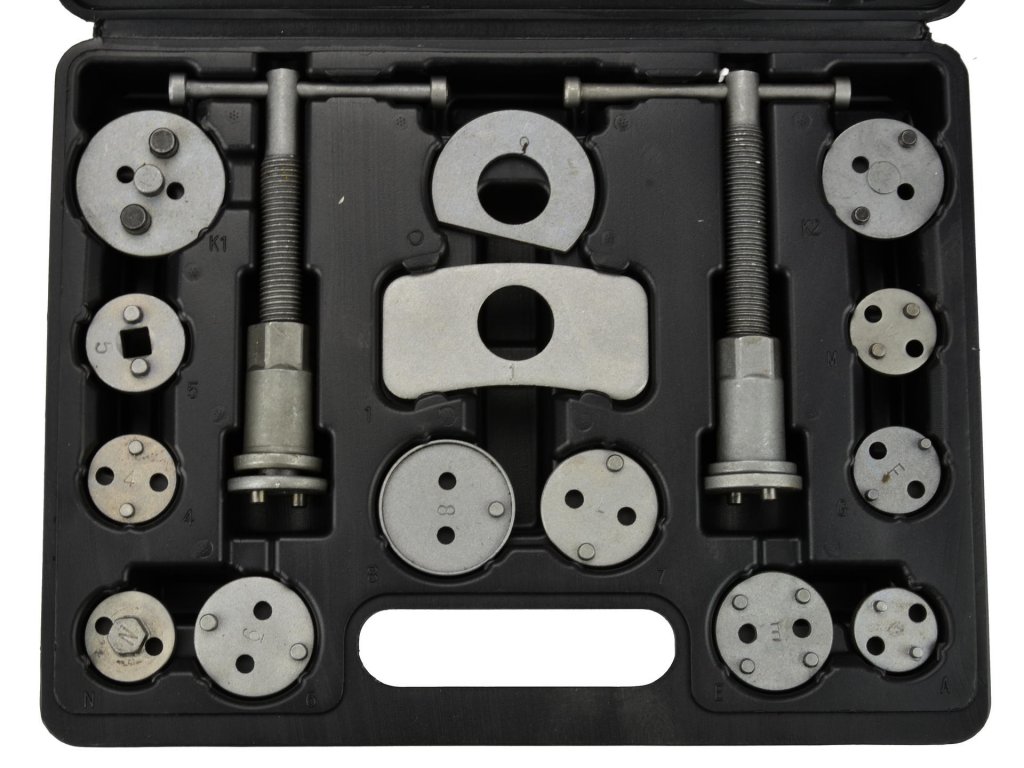 Kupujete ojazdené auto? Počujete pri brzdení piskľavý zvuk? Je načase vymeniť brzdové doštičky. Funkčné brzdy sú základom bezpečnosti na cestách. Stlačovák brzdových piestov - 21 dielna praktická sada je nevyhnutný profesionálny pomocník na opravu vozidiel, ktoré sú vybavené kotúčovými brzdami. Slúži na vyťahovanie (stláčanie) piestov vo valcoch brzdovej sústavy. Pre väčšinu automobilov na trhu: Audi, Fiat, Ford, Isuzu, Honda, Jaguar, BMW, Mercedes Benz, Mitsubishi, Nissan, Toyota, Renault, Volvo, Citroen, Opel, SAAB, GM a VW.