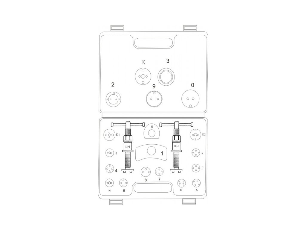 Sada oddeľovačov pre brzdové strmene s ručným pohonom pre obsluhu nasúvacích (predné brzdy) a skrutkovacích (zadné brzdy) strmeňov. Sada obsahuje dva lisy (pravé a ľavé riadenie), dve rôzne tvarované tyče na pridržanie lisu na sedle strmeňa a 17 adaptérov prispôsobených veľkosti brzdových piestov používaných vo väčšine osobných automobilov vyrábaných na európskom a ázijskom trhu.