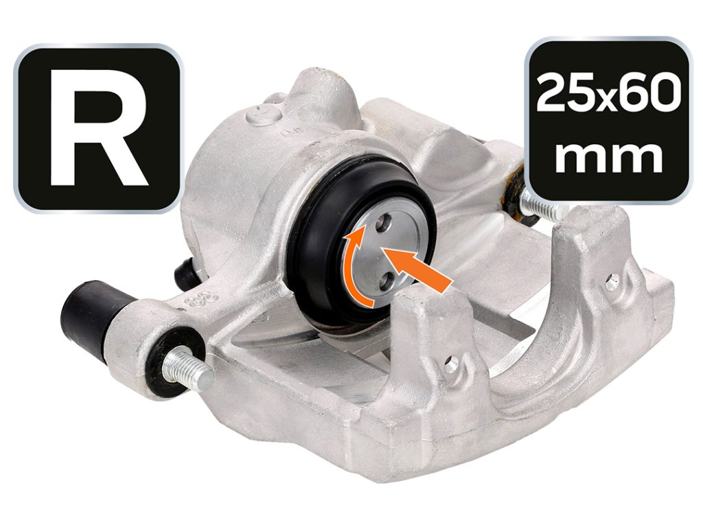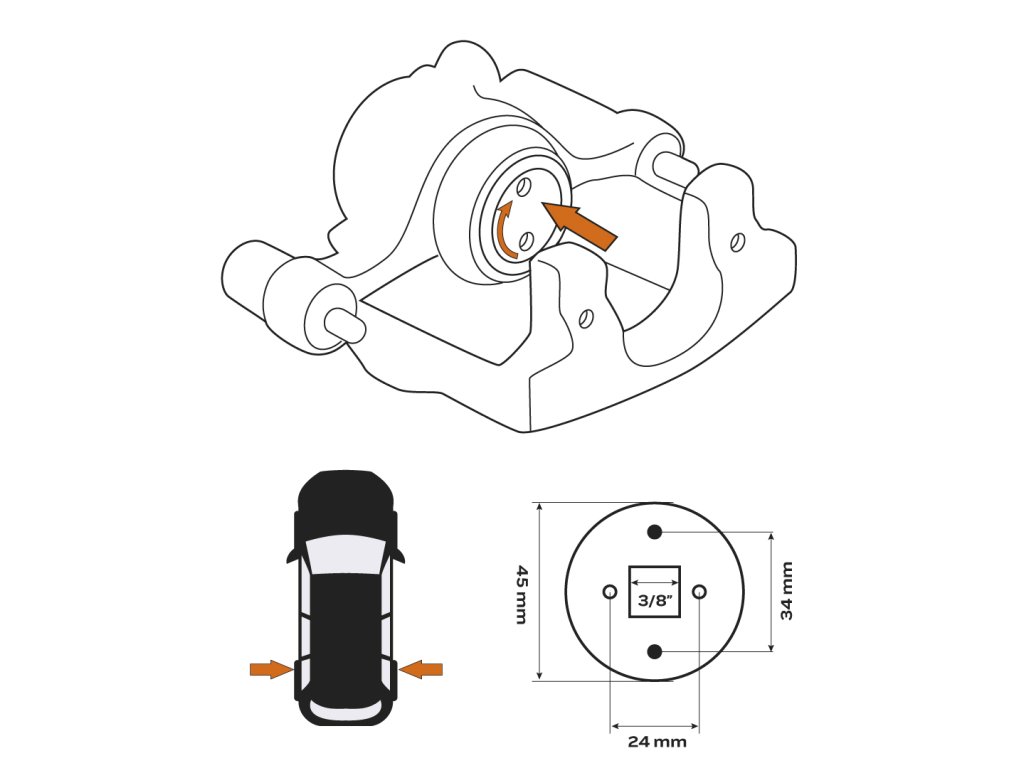 Oddeľovač brzdových strmeňov s pravým závitom, rozsah 25 - 60 mm, sada: gombík, obojstranný adaptér pre zadné strmene (rozstup čapov 24 a 34 mm), dorazová doštička.