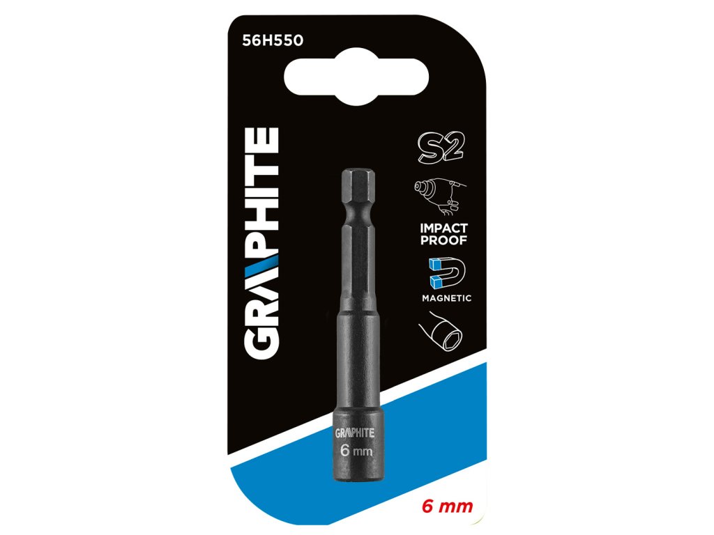 Rázová hlavica GRAPHITE (ref. 56H650) 6 x 65 mm. Určené na aplikácie s väčším krútiacim momentom pomocou rázových ovládačov alebo skrutkovačov. Vyrobené z vysokokvalitnej ocele S2, ktorá sa vyznačuje zvýšenou pružnosťou a odolnosťou voči mechanickému poškodeniu. Magnetický hrot zabraňuje vypadnutiu bitu počas práce. Značka GRAPHITE ponúka široký sortiment elektrického náradia, ktoré spĺňa potreby profesionálov.