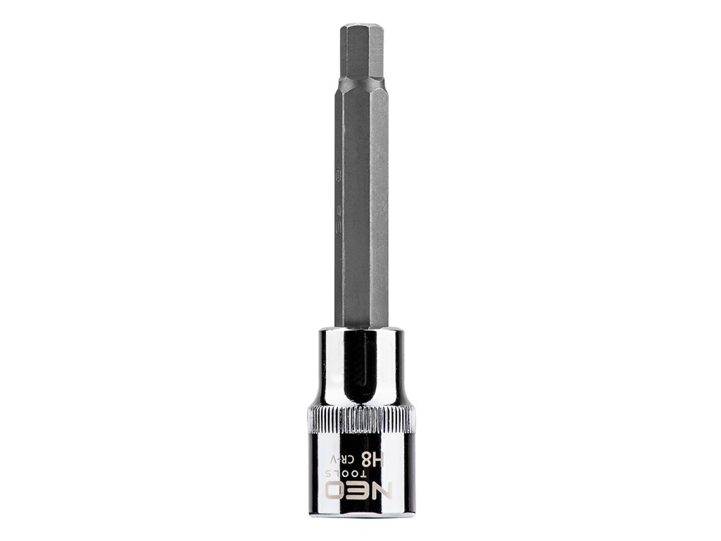 Šesťhranná koncovka na 1/2" nástrčnom hrote NEO (ref. 08-783) veľkosť H8, dĺžka 100 mm, podľa DIN 7422. Nástrčný hrot je vyrobený z odolnej chróm-vanádiovej ocele. Šesťhranný koniec z vysokokvalitnej legovanej ocele S2. Kvalita náradia potvrdená certifikátom TÜV a 25-ročnou zárukou výrobcu. Značka NEO spĺňa očakávania profesionálov.
