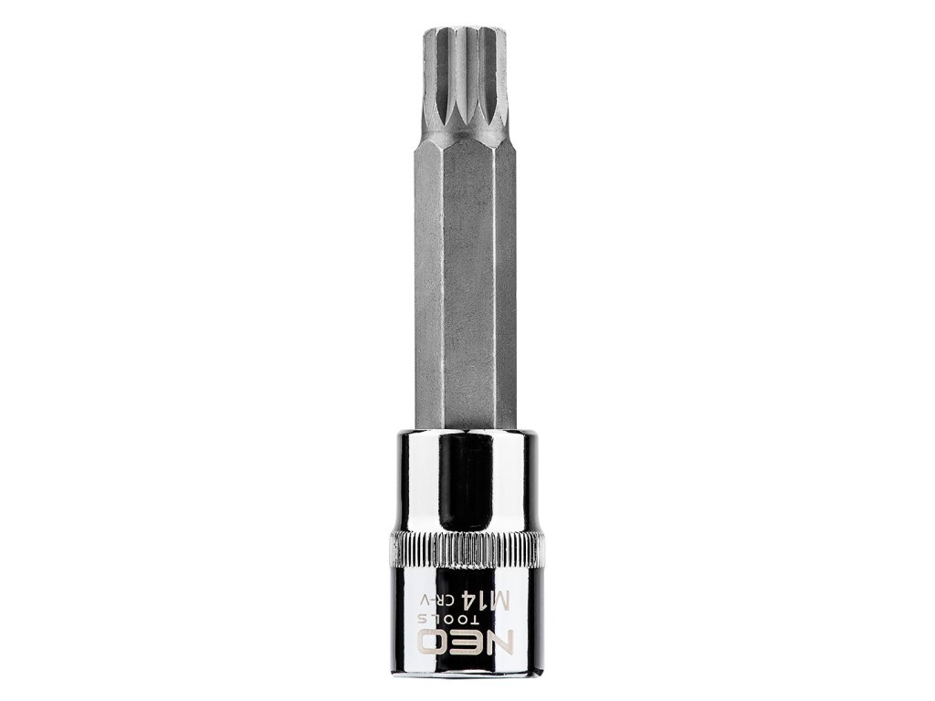 Drážkovaný hrot na 1/2" nástrčku NEO (ref. 08-745) veľkosť M14, dĺžka 100 mm. Zásuvka je vyrobená z odolnej chróm-vanádiovej ocele. Šesťhranné zakončenie z vysokokvalitnej legovanej ocele S2. 25-ročná záruka výrobcu potvrdzuje vysokú kvalitu nástroja. Značka NEO spĺňa očakávania profesionálov.