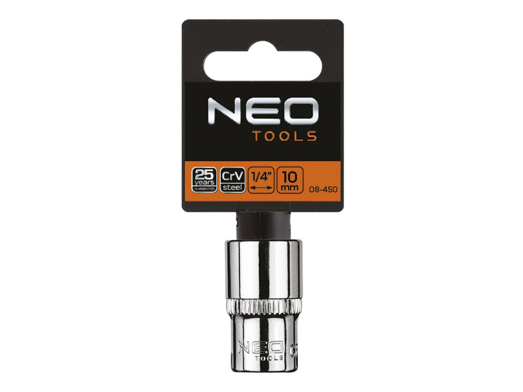 1/4" 10 mm šesťhranná hlavica NEO (ref. 08-450) z odolnej chróm-vanádiovej ocele. Vlnitý povrch zlepšuje priľnavosť zásuvky. Kvalitu nástroja potvrdzuje 25-ročná záruka výrobcu. Značka NEO spĺňa očakávania profesionálov.4