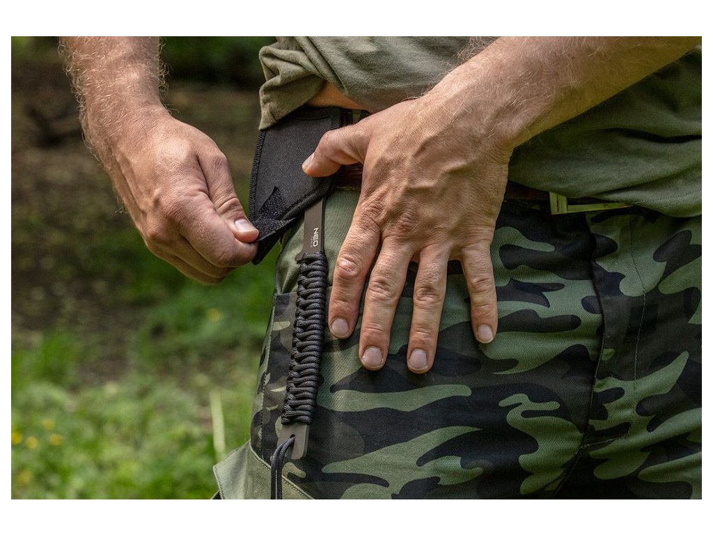 Rukoväť perfektne padne do ruky, keďže je pokrytá odolným paracordovým lanom. Zapletené lano ja štýlové a poskytuje možnosť silného úchopu, bez obáv z vyšmyknutia. Čepeľ je možné zabezpečiť silný nylonovým puzdrom, ktoré bráni mimovoľnému porezaniu sa, navyše je vybavené textilnou prackou pre jednoduché pripnutie k opasku. Ďalšou výhodou sú výrezy na skrutky o veľkosti M10, M13 a M16.