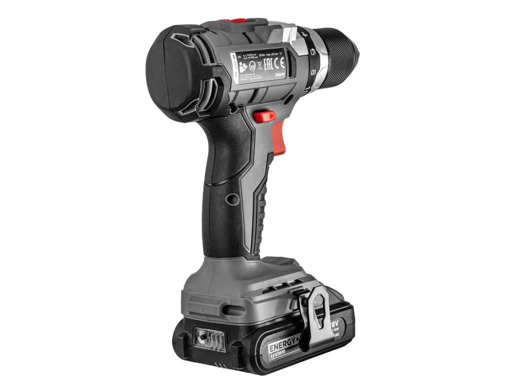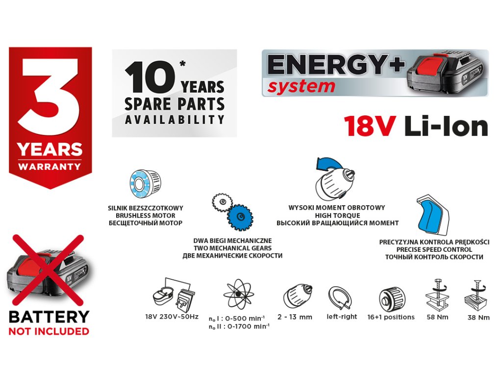 Akumulátorový vŕtací skrutkovač je kompatibilný s 18V Li-Ion batériami Energy +. Označenie Energy + značí, že akumulátor je možné použiť pre všetky zariadenia, ktoré podporujú akumulátory s týmto označením. Je možné teda náradie s akumulátormi kombinovať.