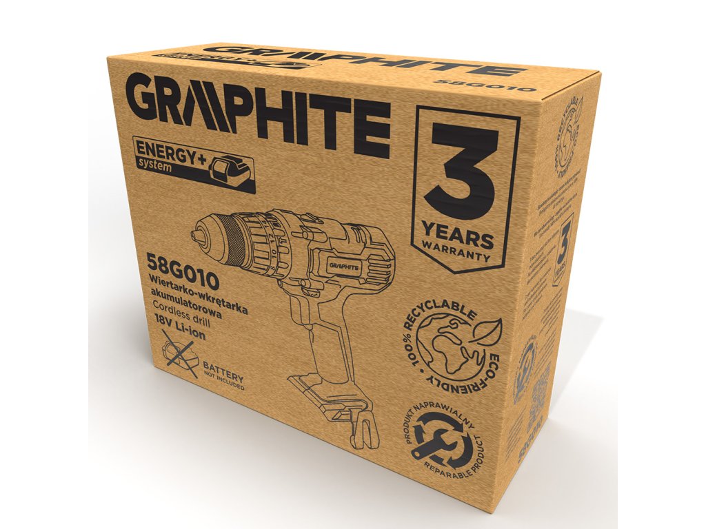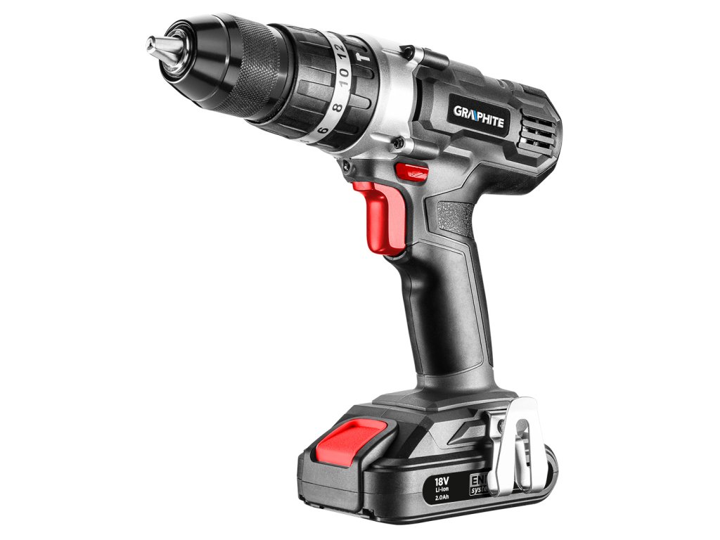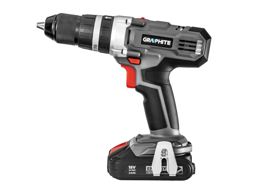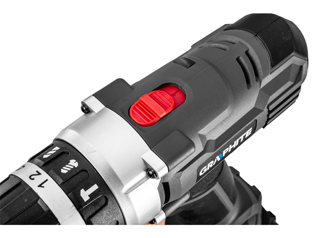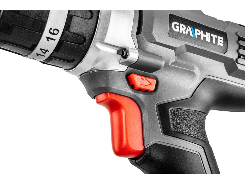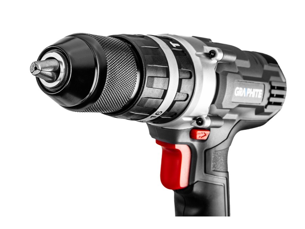 Dvojrýchlostný vŕtací skrutkovač GRAPHITE s príklepom, spolupracuje s akumulátormi 18 V Li-Ion GRAPHITE Energy+. Elektrické náradie má plynulú reguláciu rýchlosti otáčania a je vybavené prepínačom smeru otáčania. Samoupevňovacie skľučovadlo umožňuje používanie príslušenstva s priemerom 2-13 mm. Maximálna rýchlosť otáčania vretena na prvej rýchlosti je 350 a na druhej 1250 otáčok za minútu. Frekvencia mechanického príklepu na prvej rýchlosti dosahuje hodnotu 5250, a na druhej 18750 úderov za minútu. Maximálny krútiaci moment je 35 Nm (mäkké skrutkovanie) / 55 Nm (tvrdé) a možno ho regulovať pomocou 16-stupňovej spojky s dodatočným rýchlym prepínačom režimu práce pre skrutkovanie, vŕtanie a vŕtanie s príklepom. Zariadenie je vybavené elektrickou brzdou motora a automatickým blokovaním vretena. Automaticky spúšťaná LED dióda osvetľuje miesto práce. Ergonomický tvar rukoväte a kompaktná konštrukcia vŕtacieho skrutkovača umožňujú pohodlnú prácu aj v ťažkých podmienkach. Rukoväť je pokrytá protišmykovým materiálom, vďaka čomu možno nástroj pevne uchopiť v ruke. Planétová prevodovka je vyrobená z prvotriednej ocele.