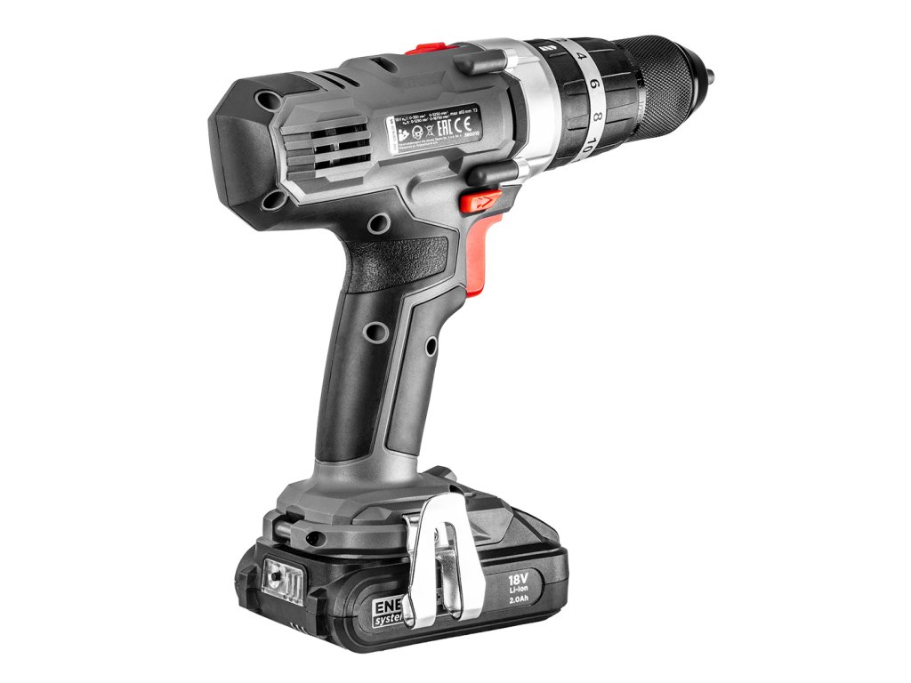 Akumulátorový vŕtací skrutkovač 18 V, Li-Ion, otáčky I: 0-350 min?? II: 0-1250 min??, príklep I: 0-5250 min-1 II: 0-18750 min-1, vpravo/vľavo, samoupevňovacie skľučovadlo 2-13 mm, polohy krúžku spojky 1-16 (a dodatočný prepínač skrutkovania, vŕtania a vŕtania s príklepom), krútiaci moment (mäkký/tvrdý): 35/55 Nm, brzda vretena, (LxH) 230 x 220 mm, hmotnosť 1.3 kg, kompatibilná s akumulátormi Energy+