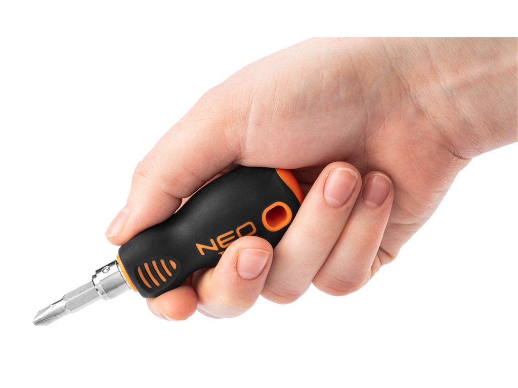 Obojstranný skrutkovač NEO (ref. 04-201) obsahuje rukoväť a obojstranný skrutkovací bit (plochý, krížový). Magnetické bity sú vyrobené z mimoriadne odolnej chróm-vanádiovej ocele. Praktická rukoväť z dvoch materiálov je odolná voči chemikáliám, olejom a tukom. Spoľahlivosť výrobku potvrdzuje 25-ročná záruka. Značka NEO spĺňa očakávania profesionálov.