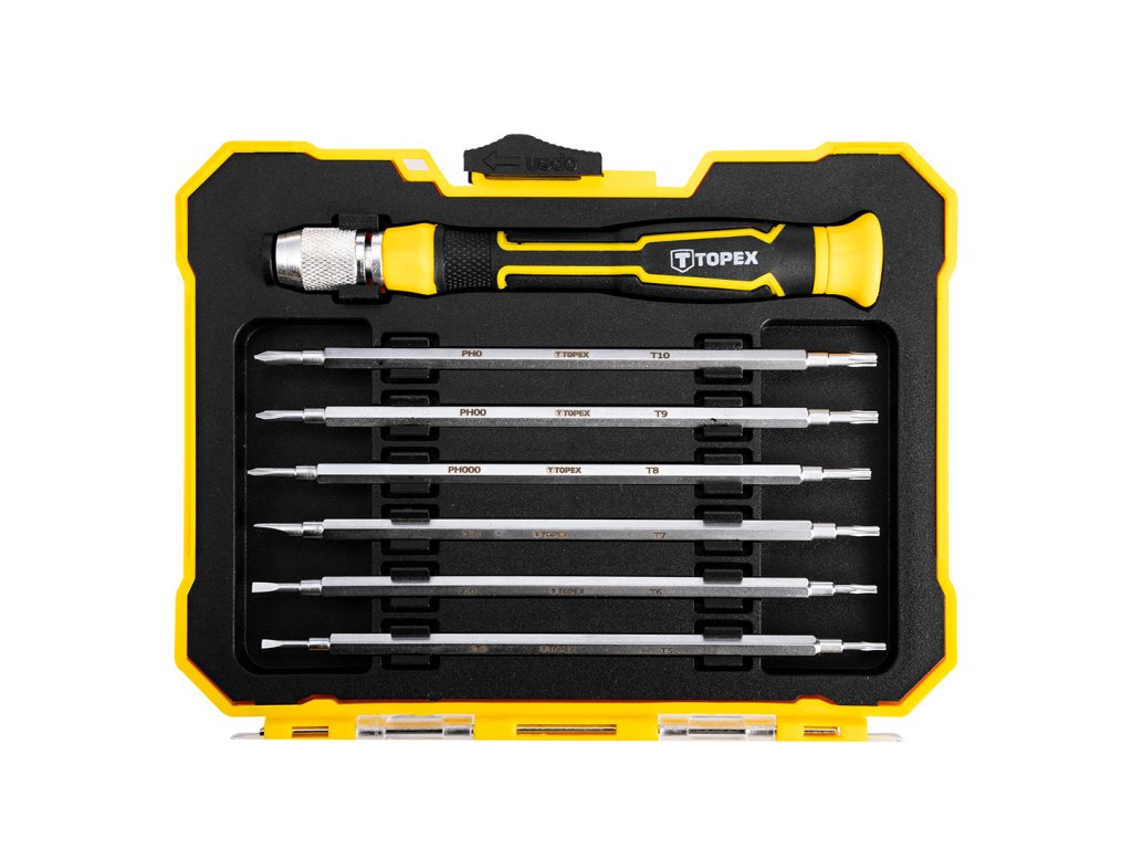 Sada presných skrutkovačov TOPEX (ref. 39D551) obsahuje 6 obojstranných čepelí, t. j. 12 bitov. Vyrobené z kvalitnej chróm-vanádiovej ocele, ktorá zaručuje dlhú životnosť nástrojov. Ergonomická plastová rukoväť poskytuje pohodlie pri práci. Praktický plastový obal na jednoduché skladovanie. Značka TOPEX je určená pre domácich majstrov.