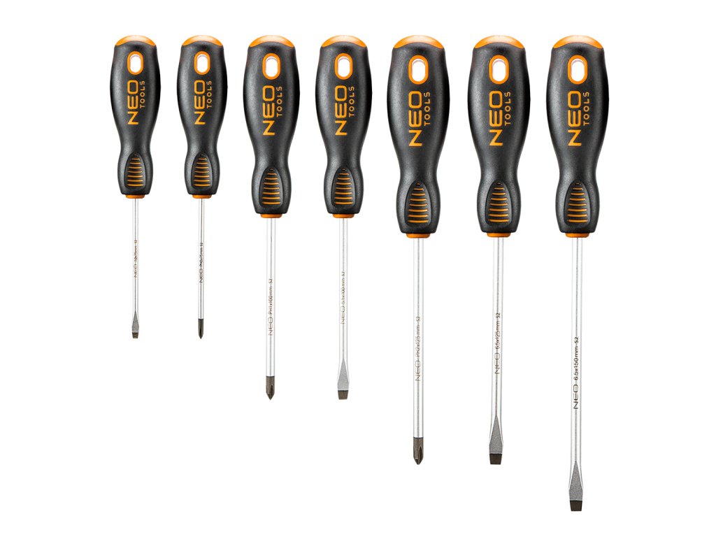 Súprava skrutkovačov NEO (ref. č. 04-206) obsahuje 7 skrutkovačov: ploché a krížové. Hrot skrutkovača je zhotovený z mimoriadne odolnej ocele S2. Pracovný nástavec hrotu bol tepelne opracovaný, vďaka čomu získal primeranú tvrdosť a odolnosť voči ohnutiu. Skrutkovač má magnetický nástavec. Trojhranný tvar držiaka s vyprofilovanou oporou pre palec znižuje zaťaženie rúk pri práci a uľahčuje dosiahnutie optimálneho momentu otáčania. Držiak z dvoch materiálov zabraňuje šmýkaniu v ruke, je odolný voči pôsobeniu chemikálií, olejov a mazív. Kvalita nástroja je potvrdená 25-ročnou zárukou výrobcu. Značka NEO spĺňa očakávania profesionálov.