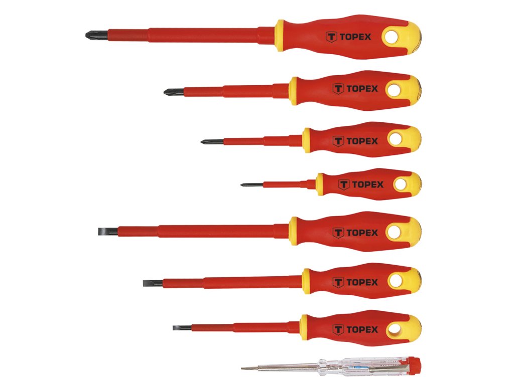 Sada skrutkovačov 1000V TOPEX (ref. 39D674) určená na prácu s napätím do 1000 V. Každý zo siedmich skrutkovačov je vyrobený z kvalitnej chróm-vanádiovej ocele, izolovaný. Okrem toho súprava obsahuje elektrickú skúšačku 125 - 250 V. Ergonomická plastová rukoväť pokrytá protišmykovým materiálom poskytuje pohodlie a bezpečnosť pri práci. Značka TOPEX je určená pre domácich majstrov.