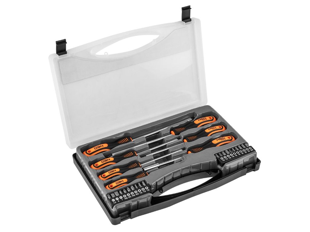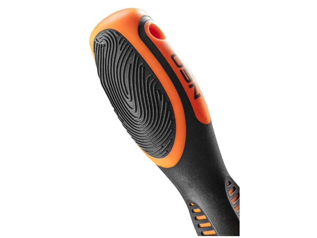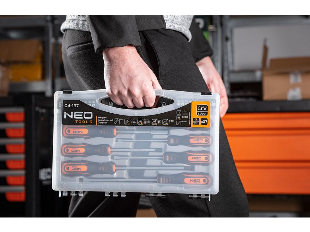 Sada skrutkovačov Neo vyrobená z CrV ocele, ktorá je odolná a trvácna aj pri vysokom zaťažení. Rukoväť je potiahnutá dvojzložkovým materiálom, zároveň je ergonomická, trojuholníkovo tvarovaná a protišmyková, takto je zabezpečená maximálna bezpečnosť a pohodlie pri práci. Priestor pre palec imitujúci otlačok prsta zvyšuje pohodlnosť úchopu a znižuje namáhanie ruky a zápästia. Špeciálne navrhnuté aby ste získali maximálny krútiaci moment. Na hornej časti rukoväte je označenie, ktoré uľahčuje výber skrutkovača pre konkrétnu prácu.