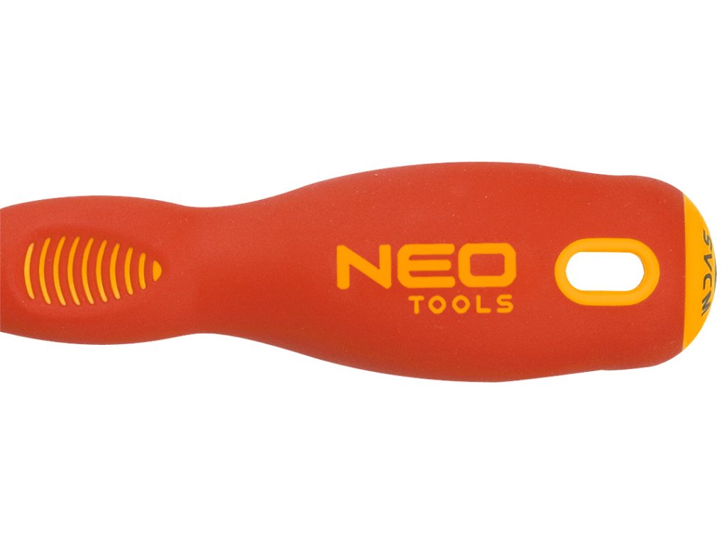 Krížový skrutkovač NEO 1000V (ref. 04-073) s rozmermi PH2 x 100 mm. Schválený na prácu pod napätím do 1000 V. Čepeľ skrutkovača je vyrobená z mimoriadne pevnej ocele S2. Pracovný hrot čepele bol tepelne upravený, čo má za následok vhodnú tvrdosť a odolnosť voči ohybu. Skrutkovač má magnetický hrot. Trojuholníkový tvar rukoväte s tvarovanou opierkou pre palec znižuje namáhanie ruky pri práci a uľahčuje dosiahnutie optimálneho krútiaceho momentu. Rukoväť z dvoch materiálov zabraňuje kĺzaniu v ruke a je odolná voči chemikáliám, olejom a tukom. Kvalitu náradia potvrdzuje certifikát TÜV a 25-ročná záruka výrobcu. Značka NEO spĺňa očakávania profesionálov.