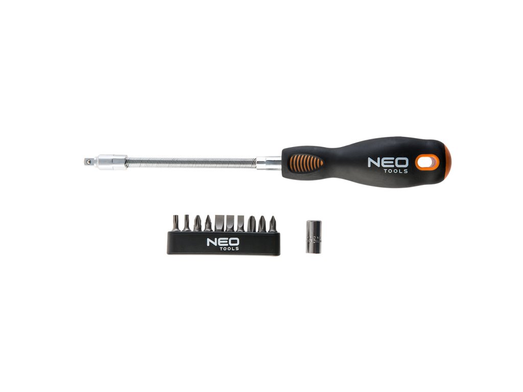 Skrutkovač NEO s flexibilnou čepeľou (ref. 04-212) obsahuje rukoväť, 10 skrutkovacích bitov (plochý, krížový, Torx) a adaptér. Magnetické bity sú vyrobené z mimoriadne odolnej chróm-molybdénovej ocele. Ohybná čepeľ umožňuje prácu na ťažko prístupných miestach. Trojuholníkový tvar rukoväte s tvarovanou opierkou pre palec znižuje zaťaženie ruky pri práci a uľahčuje dosiahnutie optimálneho krútiaceho momentu. Rukoväť z dvoch materiálov je odolná voči chemikáliám, olejom a tukom. Kvalita náradia potvrdená certifikátom TÜV a 25-ročnou zárukou výrobcu. Značka NEO spĺňa očakávania profesionálov.