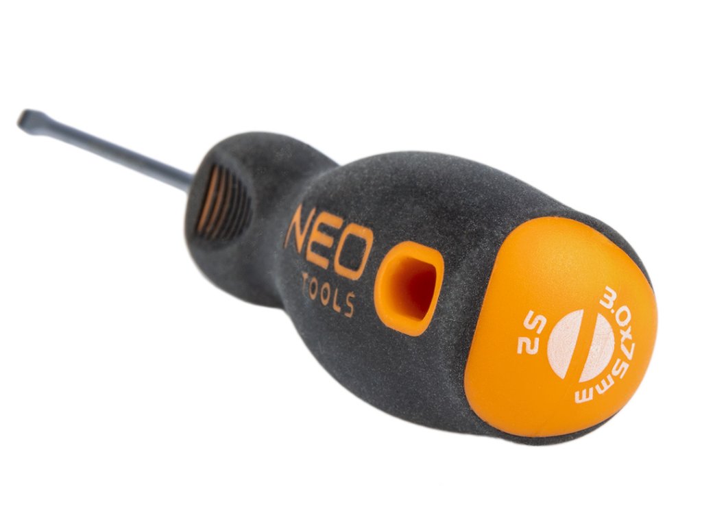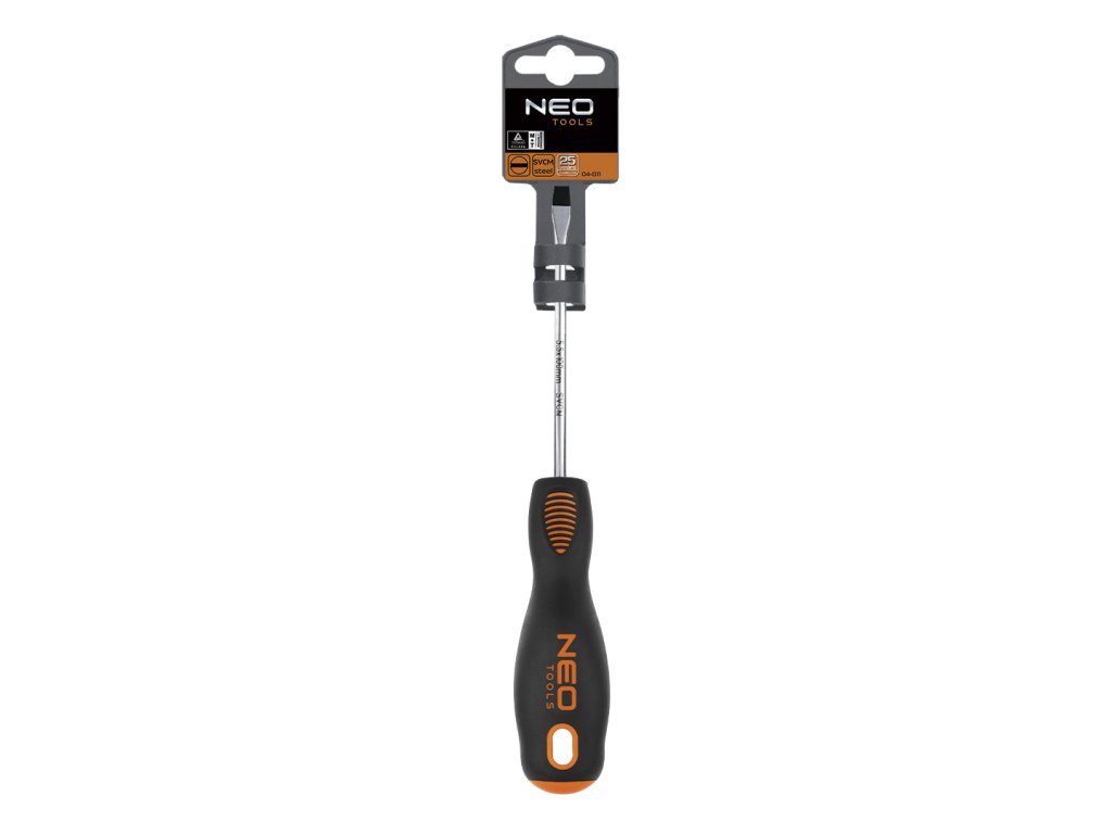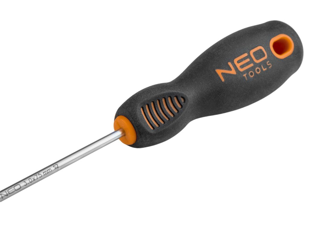 Plochý skrutkovač NEO (ref. 04-011) s rozmermi 3,0 x 75 mm. Čepeľ skrutkovača je vyrobená z mimoriadne odolnej ocele S2. Pracovný hrot skrutkovača bol tepelne spracovaný, vďaka čomu sa dosiahla vhodná tvrdosť a odolnosť proti ohybu 56 HRC. Skrutkovač má magnetický hrot. Trojuholníkový tvar rukoväte s profilovanou opierkou palca znižuje zaťaženie ruky počas práce a uľahčuje dosiahnutie optimálneho krútiaceho momentu. Rukoväť z dvoch materiálov zabraňuje kĺzaniu v ruke a je odolná voči chemikáliám, olejom a tukom. Kvalitu nástroja potvrdzuje certifikát TÜV a 25-ročná záruka výrobcu. Značka NEO spĺňa očakávania profesionálov.