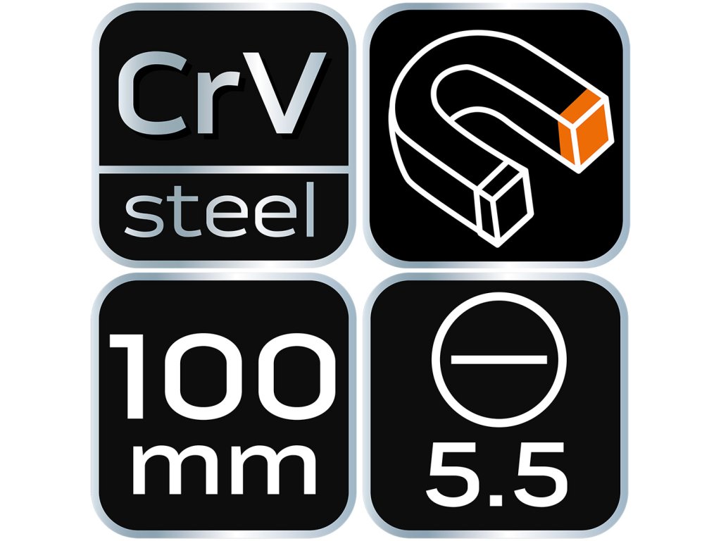 Plochý skrutkovač 5,5 x 100 mm, tvrdený hrot, magnetický hrot, CrV oceľ, dvojitá rukoväť