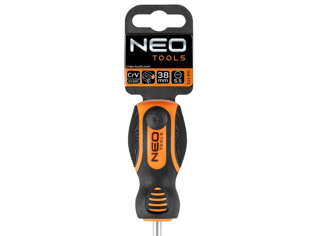 Plochý skrutkovač NEO (ref. 04-173) 5,5 x 38 mm. Čepeľ je vyrobená z odolnej chróm-vanádiovej ocele, čo zaručuje dlhú životnosť nástroja. Magnetický hrot z kalenej ocele uľahčuje prácu s nástrojom. Ergonomická plastová rukoväť pokrytá protišmykovým materiálom zaisťuje bezpečnosť a pohodlie pri práci. Značka NEO spĺňa očakávania profesionálov.