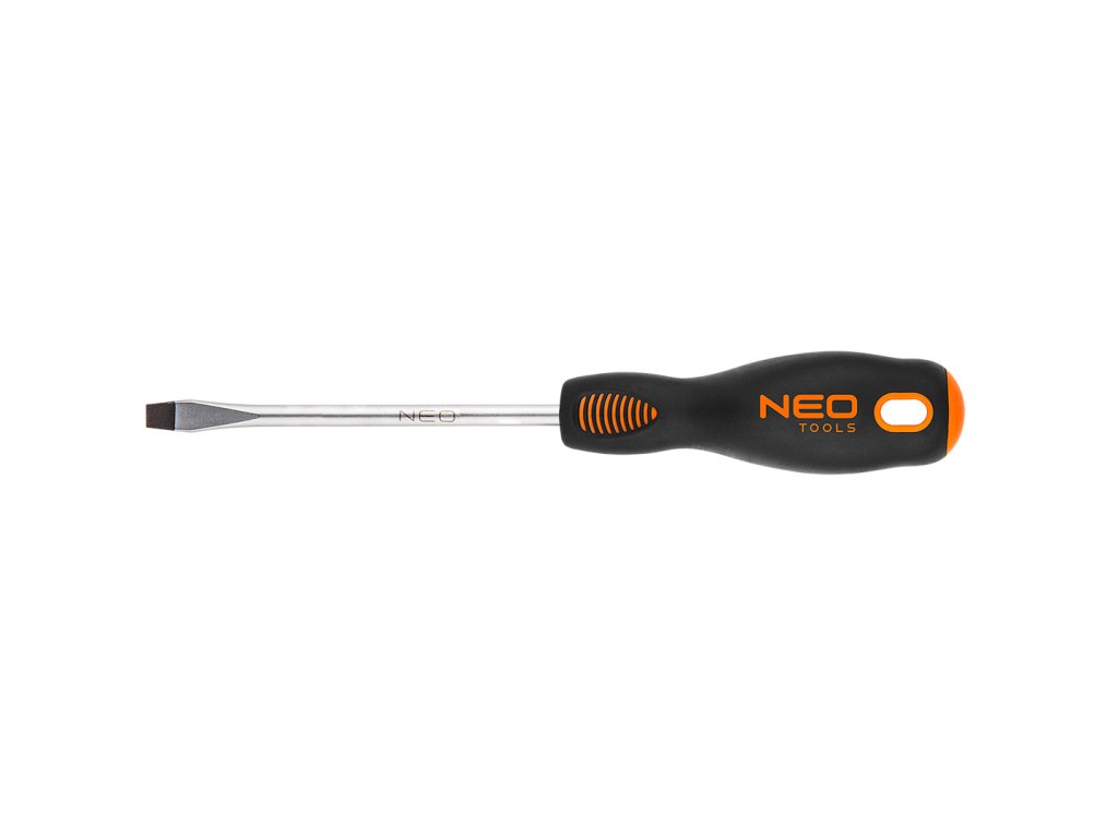 Plochý skrutkovač NEO (ref. 04-002) s rozmermi 6,5 x 125 mm. Čepeľ skrutkovača je vyrobená z mimoriadne odolnej ocele S2. Pracovný koniec čepele bol tepelne spracovaný, vďaka čomu sa dosiahla vhodná tvrdosť a odolnosť proti ohybu 56 HRC. Skrutkovač má magnetický hrot. Trojuholníkový tvar rukoväte s profilovanou opierkou palca znižuje zaťaženie ruky počas práce a uľahčuje dosiahnutie optimálneho krútiaceho momentu. Rukoväť z dvoch materiálov zabraňuje kĺzaniu v ruke a je odolná voči chemikáliám, olejom a tukom. Kvalitu nástroja potvrdzuje certifikát TÜV a 25-ročná záruka výrobcu. Značka NEO spĺňa očakávania profesionálov.
