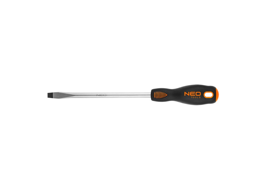 Plochý skrutkovač NEO (ref. 04-015) s rozmermi 6,5 x 150 mm. Čepeľ skrutkovača je vyrobená z mimoriadne odolnej ocele S2. Pracovný hrot skrutkovača bol tepelne spracovaný, vďaka čomu sa dosiahla vhodná tvrdosť a odolnosť proti ohybu 56 HRC. Skrutkovač má magnetický hrot. Trojuholníkový tvar rukoväte s profilovanou opierkou palca znižuje zaťaženie ruky počas práce a uľahčuje dosiahnutie optimálneho krútiaceho momentu. Rukoväť z dvoch materiálov zabraňuje kĺzaniu v ruke a je odolná voči chemikáliám, olejom a tukom. Kvalitu nástroja potvrdzuje certifikát TÜV a 25-ročná záruka výrobcu. Značka NEO spĺňa očakávania profesionálov.