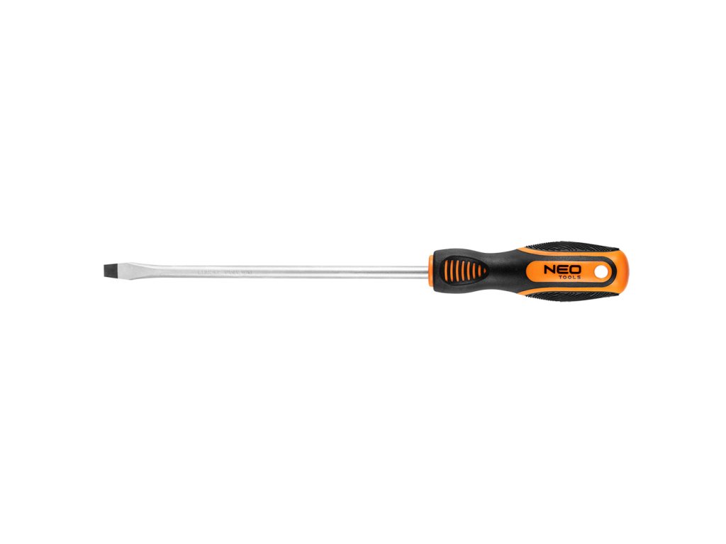 Plochý skrutkovač NEO (ref. 04-176) 8 x 200 mm. Čepeľ je vyrobená z odolnej chróm-vanádiovej ocele, čo zaručuje dlhú životnosť nástroja. Magnetický hrot z kalenej ocele uľahčuje prácu s nástrojom. Ergonomická plastová rukoväť pokrytá protišmykovým materiálom zaisťuje bezpečnosť a pohodlie pri práci. Značka NEO spĺňa očakávania profesionálov.