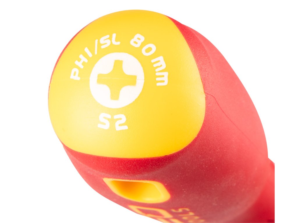 Plus-minus skrutkovač 1000 V, SL/PH1 x 80 mm, oceľ S2, trojuholníkový tvar rukoväte, tvarovaná opierka palca, certifikát VDE