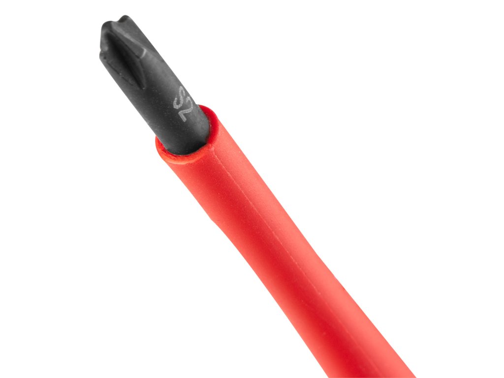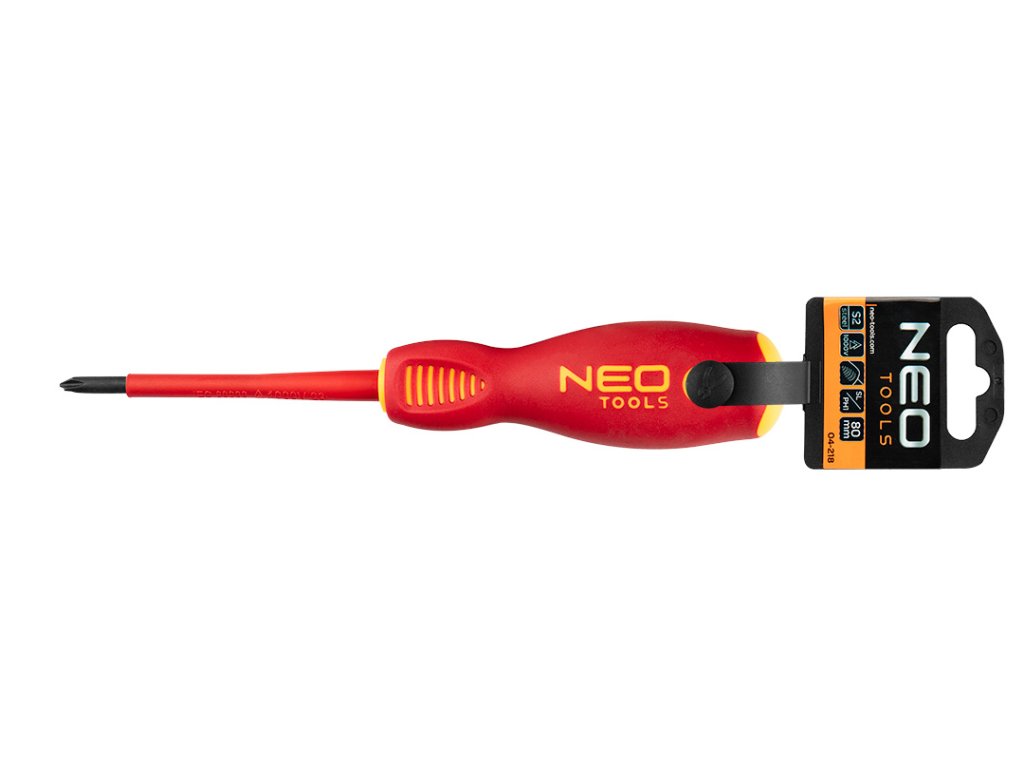 Skrutkovač plus-mínus 1000 V, SL/PH1 x 80 mm 04-218 od spoločnosti NEO je schválený nástroj na prácu pod napätím do 1000 V. Čepeľ skrutkovača je vyrobená z odolnej ocele S2. Pracovný hrot čepele bol tepelne upravený, čo má za následok primeranú tvrdosť a odolnosť voči ohybu. Špecializovaný hrot má veľkosť SL/PH1 a dĺžku 80 mm. Trojuholníkový tvar rukoväte s tvarovanou opierkou pre palec znižuje namáhanie ruky pri práci a uľahčuje dosiahnutie optimálneho krútiaceho momentu. Rukoväť z dvojitého materiálu zabraňuje kĺzaniu v ruke a je odolná voči chemikáliám, olejom a tukom. Kvalita náradia potvrdená certifikáciou VDE.