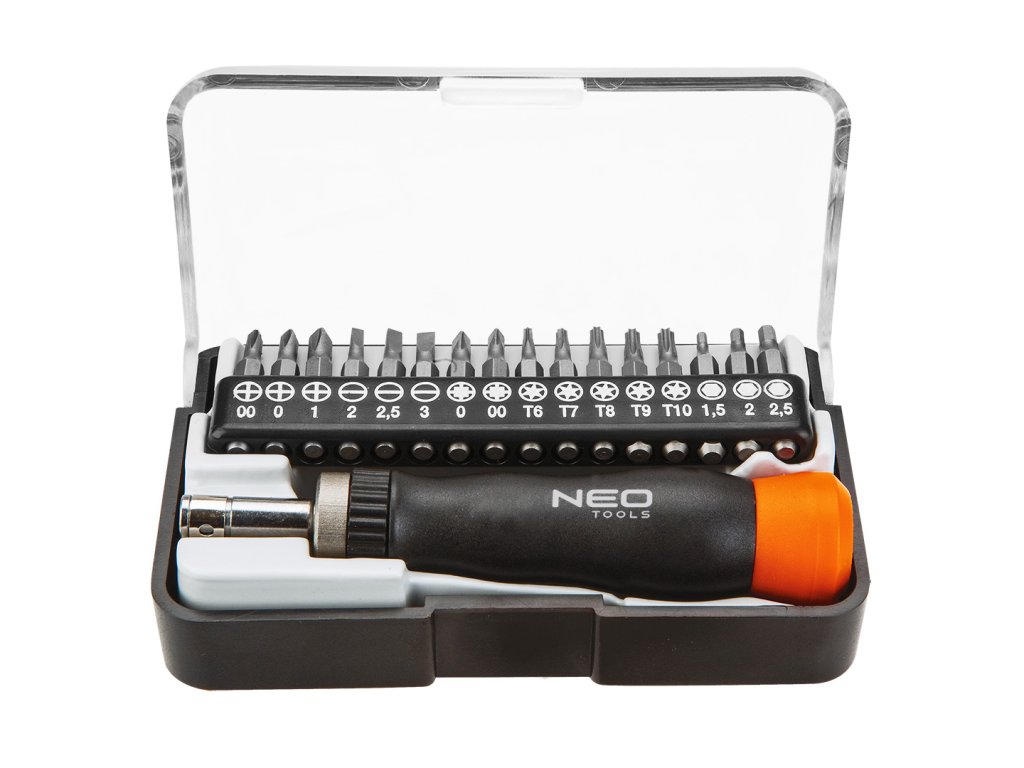 Sada presných skrutkovačov NEO (ref. 04-228) obsahuje rukoväť a 16 skrutkovacích bitov 30 mm (ploché, krížové, Torx a šesťhranné). Magnetické bity sú vyrobené z mimoriadne odolnej chróm-molybdénovej ocele. Otočná objímka v rukoväti umožňuje presné dotiahnutie skrutiek. Rukoväť z dvoch materiálov je odolná voči chemikáliám, olejom a tukom. Celá súprava je zabalená v praktickom kufríku. Certifikát TÜV Rheinland je zárukou vysokej kvality a spoľahlivosti výrobku. Značka NEO spĺňa očakávania profesionálov.