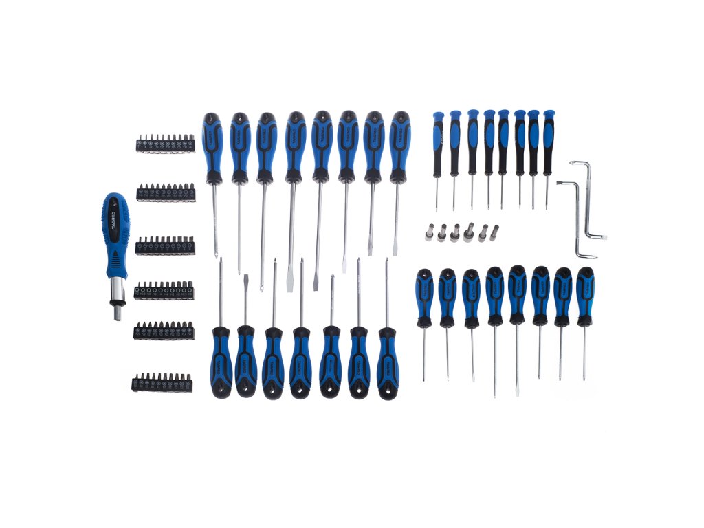 Bohatá sada skrutkovačov, ktorá bola navrhnutá s ohľadom na maximálne pohodlie používania. Je ideálne prispôsobená každej veľkosti ruky. Gumová povrchová úprava zaisťuje istý úchop a uľahčuje prácu s nástrojom. Použitie vysoko kvalitných materiálov, ako je chróm-vanádová zliatina, pri výrobe skrutkovačov výrazne predlžuje ich životnosť a odolnosť.