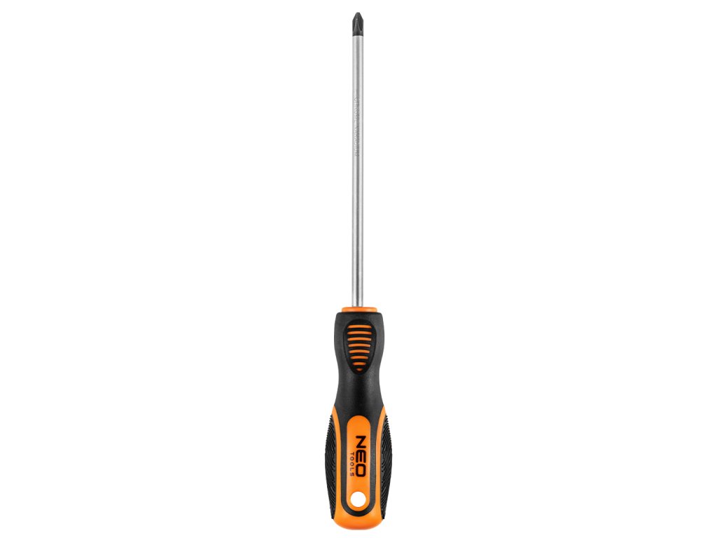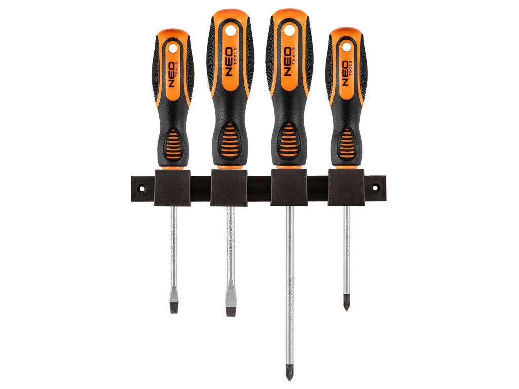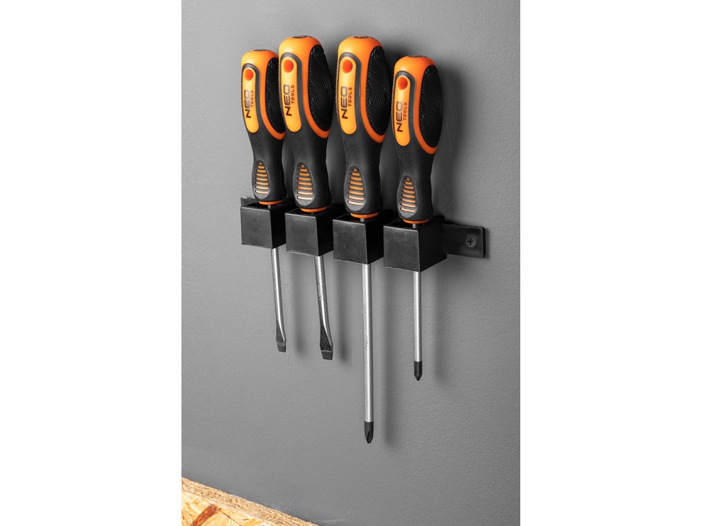 Sada skrutkovačov NEO (ref. 04-191) obsahuje 4 skrutkovače: ploché a krížové. Čepeľ skrutkovača je vyrobená z odolnej CrV ocele. Skrutkovač má magnetický hrot. Trojuholníkový tvar rukoväte s profilovanou opierkou palca znižuje zaťaženie ruky počas práce a uľahčuje dosiahnutie optimálneho krútiaceho momentu. Rukoväť z dvoch materiálov zabraňuje kĺzaniu v ruke a je odolná voči chemikáliám, olejom a tukom. to NEO brand meets the expectations of professionals.