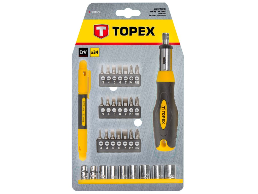 Skrutkovacie bity TOPEX (ref. 39D522) sú vyrobené z kvalitnej chróm-vanádiovej ocele, ktorá zaručuje dlhú životnosť nástroja. Ergonomická rukoväť pokrytá protišmykovým materiálom poskytuje vysoký komfort pri používaní. Ráčnový mechanizmus použitý v rukoväti šetrí čas pri práci. Okrem toho súprava obsahuje držiak na perá s bitmi, čo je pohodlné a praktické riešenie. Značka TOPEX je určená pre domácich majstrov.