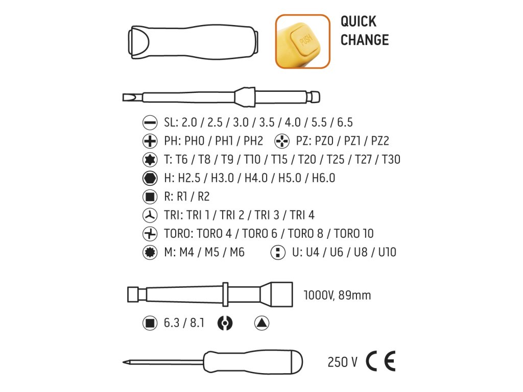 Skrutkovacie nástavce s rukoväťou, certifikát 1000V, oceľ S2, 50 kusov, nylonová predná časť, elektrický tester 3.0x190 mm 250V, veľkosti vymeniteľných nástavcov: Sl 2, 2.5, 3, 3.5, 4, 5.5, 6.5, PH0, PH1, PH2, PZ0, PZ1, PZ2, T6, T8, T9, T10, T16, T20, T26, T27, T30, H2, H3, H4, H5, H6, R1, R2, TRI1, TRI2, TRI3, TRI4, TORO4, TORO6, TORO8, TORO10, M4, M5, M6, U4, U6, U8, U10 dĺžka nástavcov 100mm, nástavce do servisných skriniek veľkosti 6,3x89, 8,1x89, 9x89, 14x89, držiak na hroty.