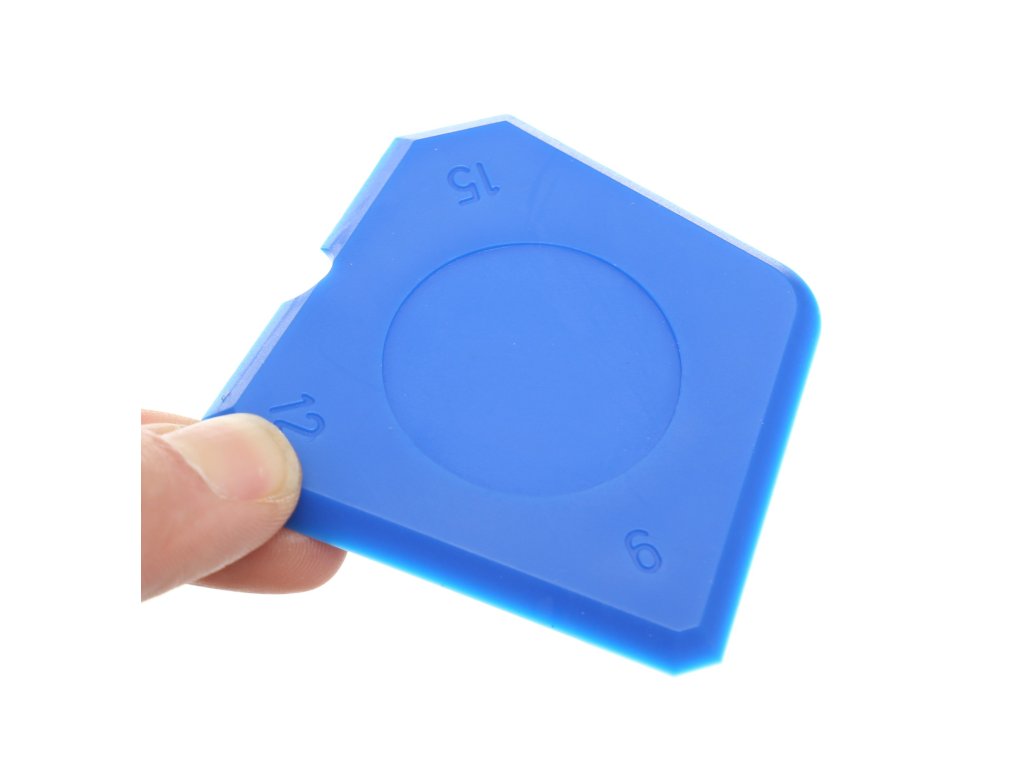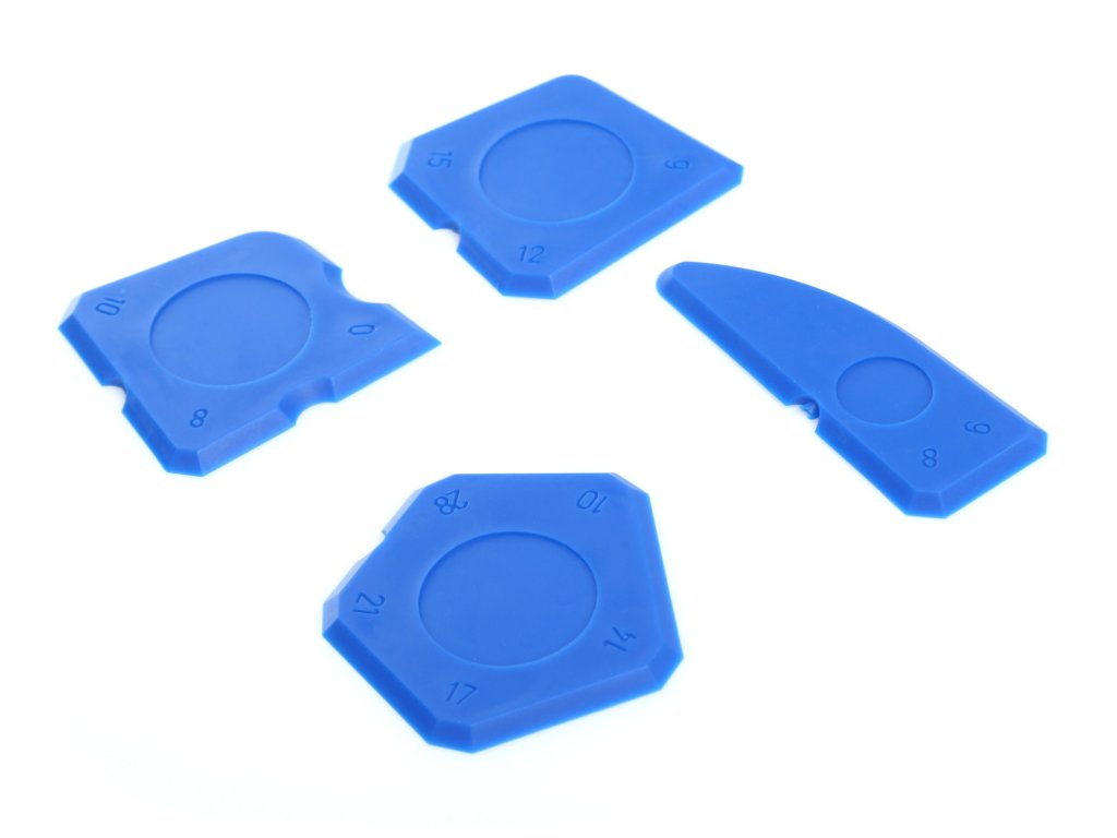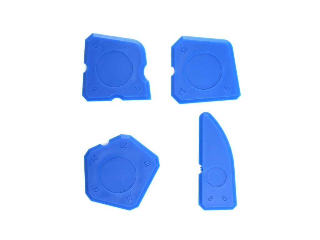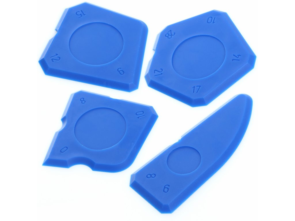 Súprava 4 špachtlí z pružného plastu na nanášanie čerstvej tesniacej hmoty (silikónu, fugy). Umožňujú dosiahnuť čistý, rovnomerne hladký povrch tesniacej hmoty. Neškodia okrajom a nepoškriabu glazované povrchy.