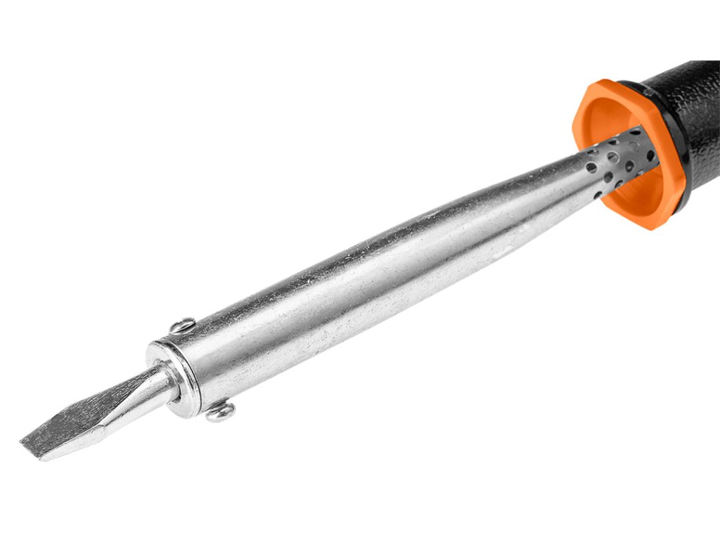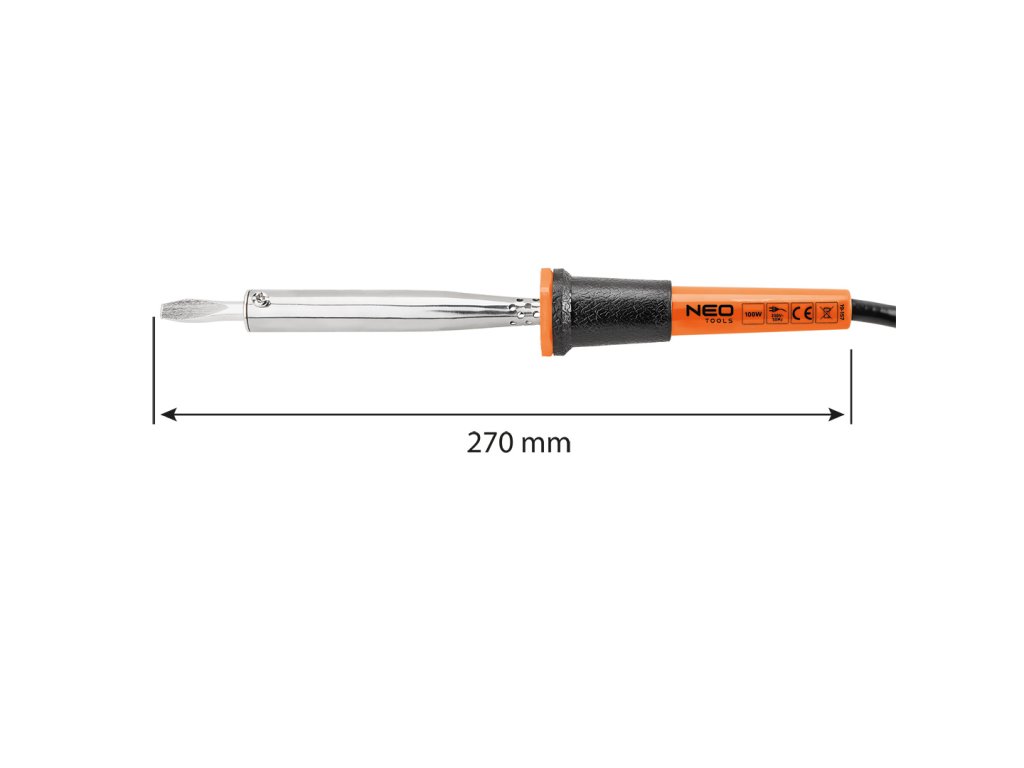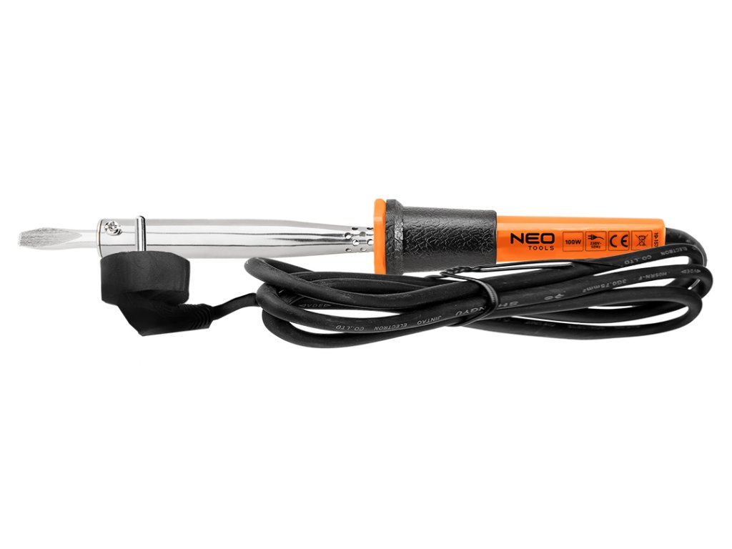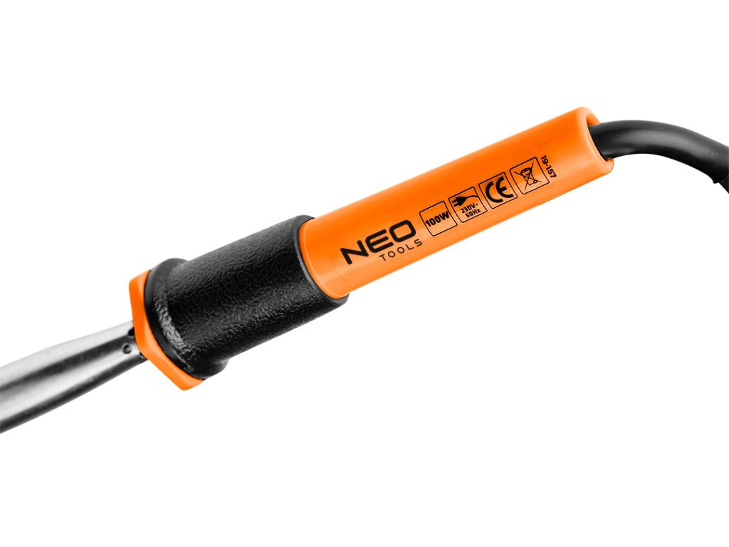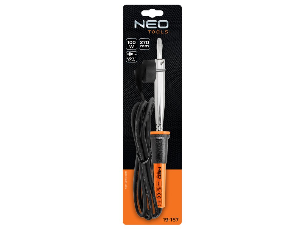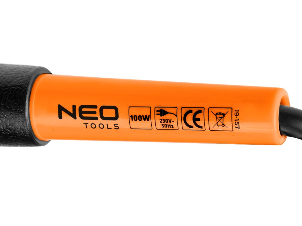100 W odporová spájkovačka 19-157 od spoločnosti NEO TOOLS je 100 W zariadenie štandardne napájané 230 V, 50 Hz. Vyznačuje sa dĺžkou 270 mm. Čas zahrievania tejto spájkovačky od spoločnosti NEO TOOLS je len 7 minút. Má certifikát CE. Nástroj je ľahký a ľahko sa používa. Osvedčí sa pri jednoduchých úlohách v dielni pre domácich majstrov.