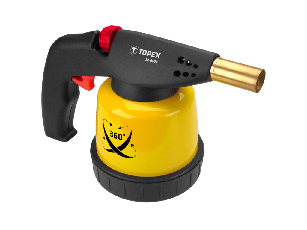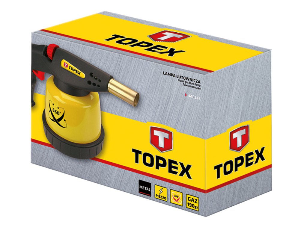Plynová spájkovacia lampa TOPEX (ref. 44E143) pre 190 g kartuše, pracovná teplota 1350 °C, výkon 1,9 kW. Svietidlo možno používať v akejkoľvek polohe, dokonca aj otočené o 180°, čo umožňuje prácu na neprístupných miestach. Kovový kryt dokonale chráni kazetu s plynom, čo zvyšuje bezpečnosť práce so svietidlom a predlžuje jeho životnosť. Má piezoelektrické zapaľovanie, ktoré umožňuje rýchle zapálenie lampy. Značka TOPEX je určená pre domácich majstrov.