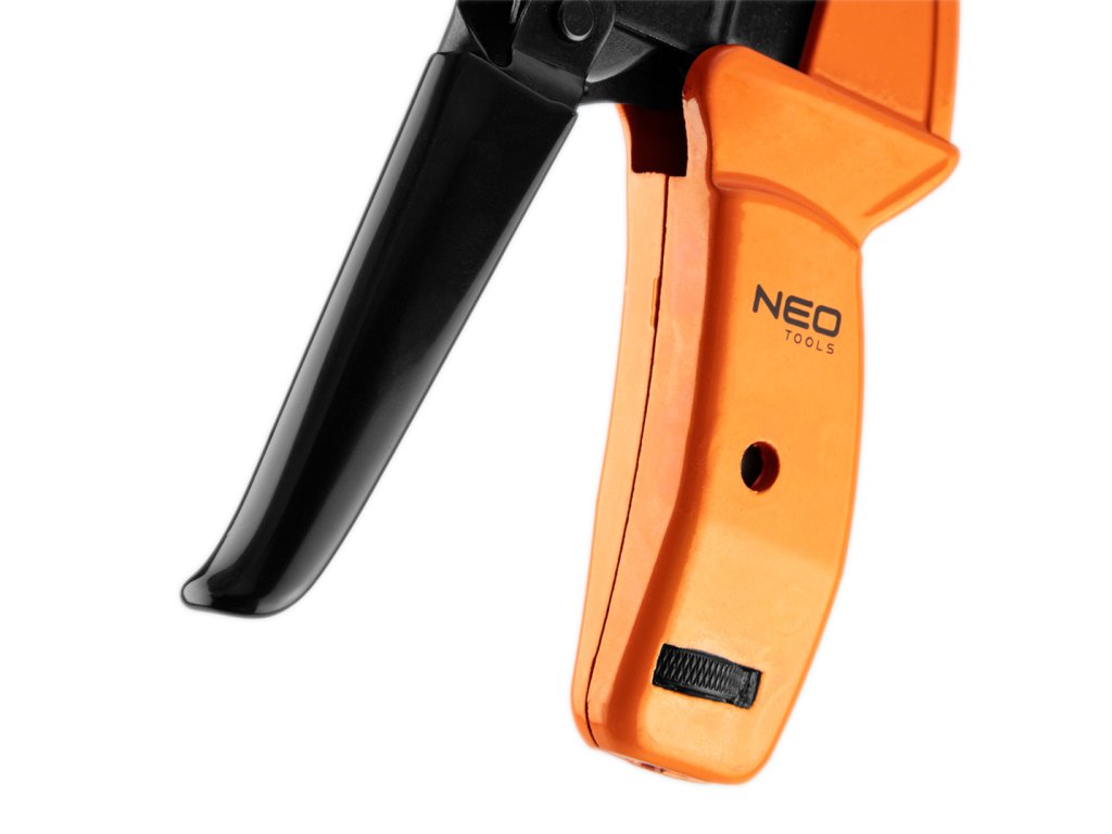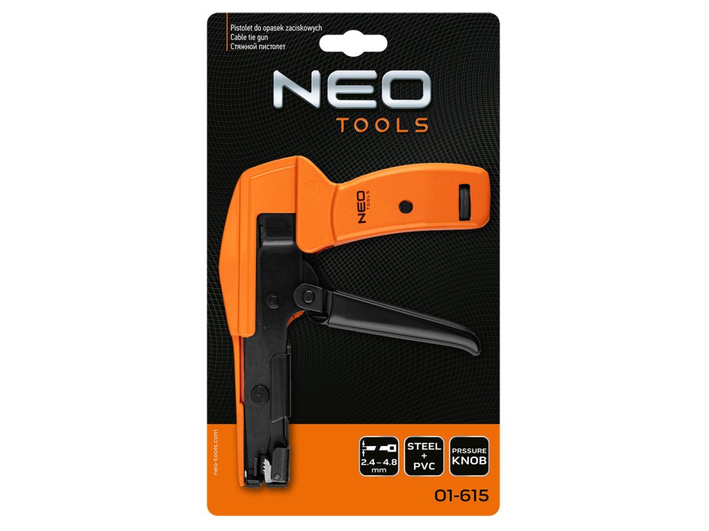 Pištoľ na stahovacié pásky NEO 01-615 vyrobená z ocele a PVC. Je vybavená prítlačným gombíkom a ponúka možnosť uťahovania a odrezávania koncov káblových viazacích pások. Užitočný nástroj pri práci elektrikára, ktorý ovplyvňuje rýchlejšie dokončenie úloh. Pištoľ podporuje maximálnu šírku kravaty 4,8 mm, rozsah dĺžok kravaty od 50 do 350 mm a maximálnu hrúbku kravaty 1,6 mm. Odporúča sa ako spoľahlivý a užitočný nástroj.