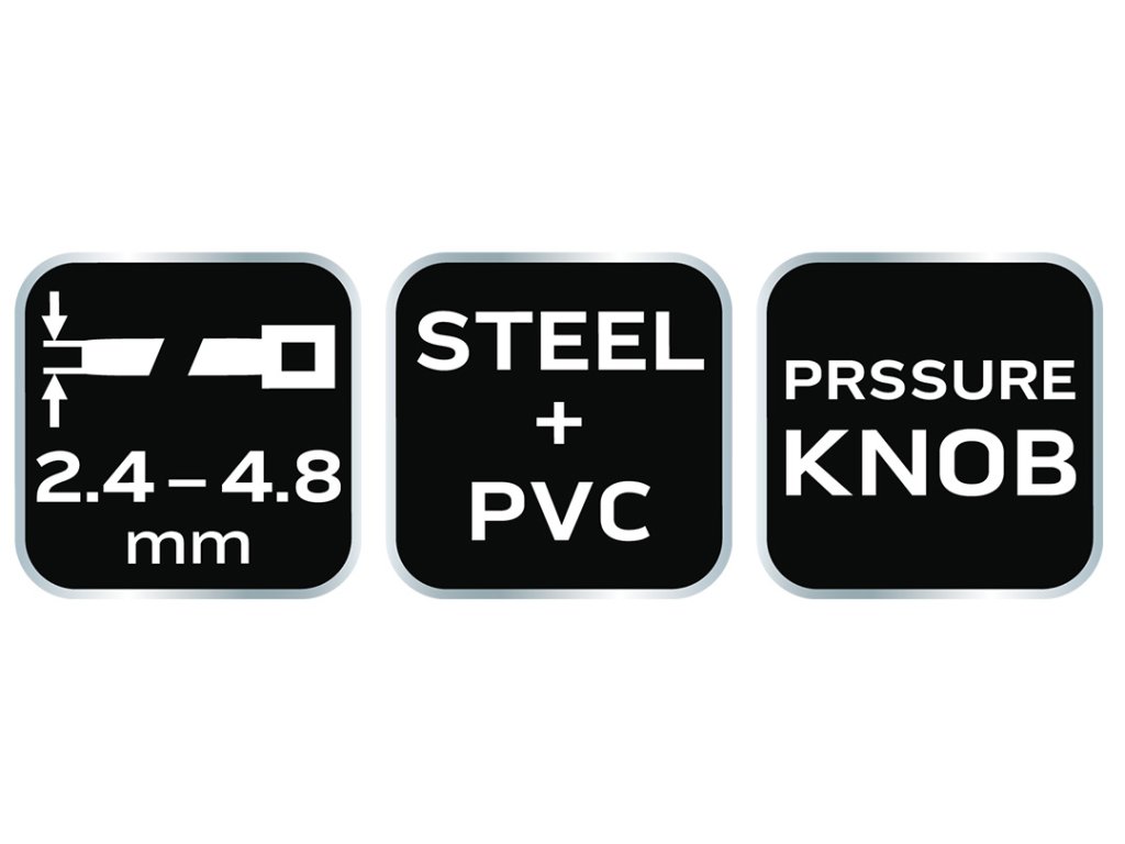 Pištoľ na stahovacié pásky, materiál oceľ + PVC, upínací gombík, max. šírka kravaty 4,8 mm, rozsah dĺžky kravaty 50-350 mm, max. hrúbka kravaty 1,6 mm