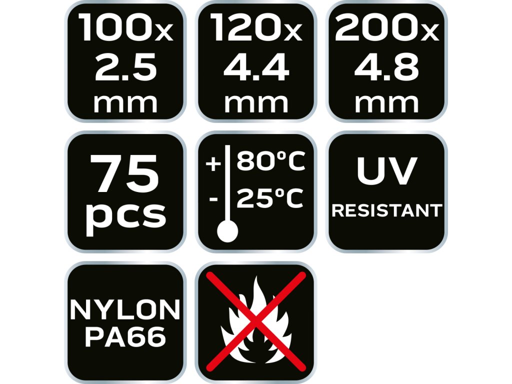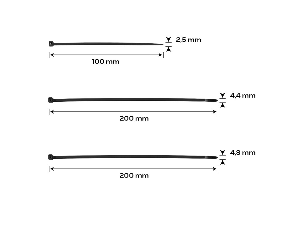 Model EXTREME, čierny, 75 kusov, materiál nylon PA66, odolný voči UV žiareniu, veľkosti: 2,5 x 100 mm, 25 kusov, 3,6 x 150 mm, 25 kusov, 4,8 x 200 mm, 25 kusov