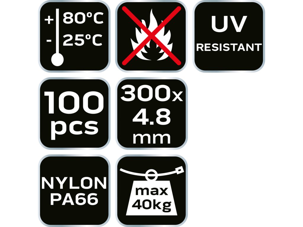 Svorky model EXTREME, rozmer 4,8 × 300 mm, farba čierna, 100 kusov, materiál nylon PA66, nosnosť 40 kg, odolné voči UV žiareniu