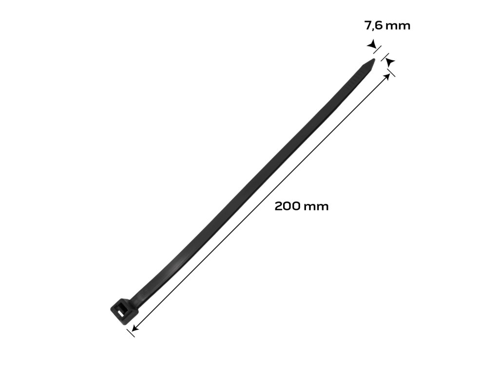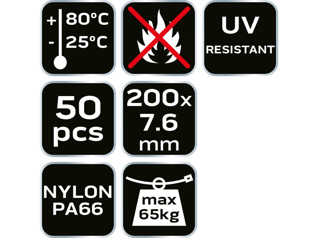 Svorky model EXTREME, rozmer 7,6 × 200 mm, farba čierna, 50 kusov, materiál nylon PA66, nosnosť 65 kg, odolné voči UV žiareniu