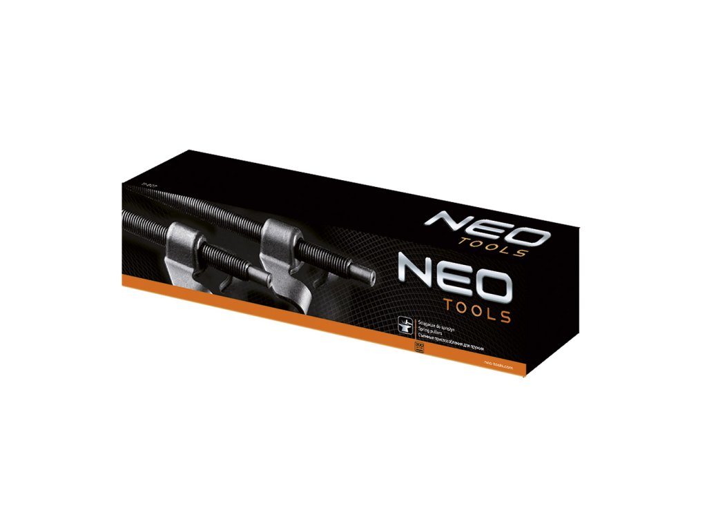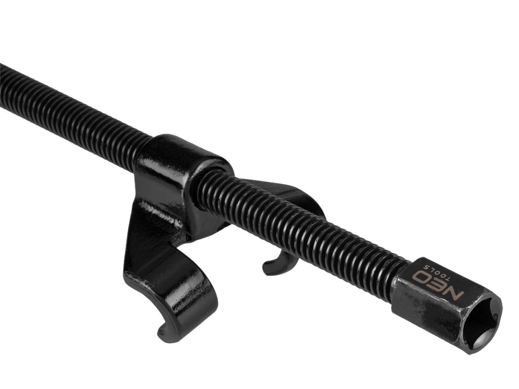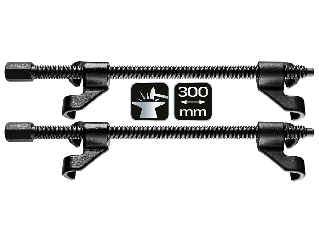 Pružinové sťahováky 300 mm, 2 ks. 11-807 od spoločnosti NEO je sada dvoch sťahovákov pružín s dĺžkou 300 mm. Vyznačujú sa 4 upevňovacími bodmi a kovanou konštrukciou. Sú v súlade s certifikátom TÜV M+T. Nástroje sú určené na demontáž a montáž pružín. Vďaka svojej robustnej konštrukcii a univerzálnemu použitiu sú ideálne na použitie v každej autodielni.