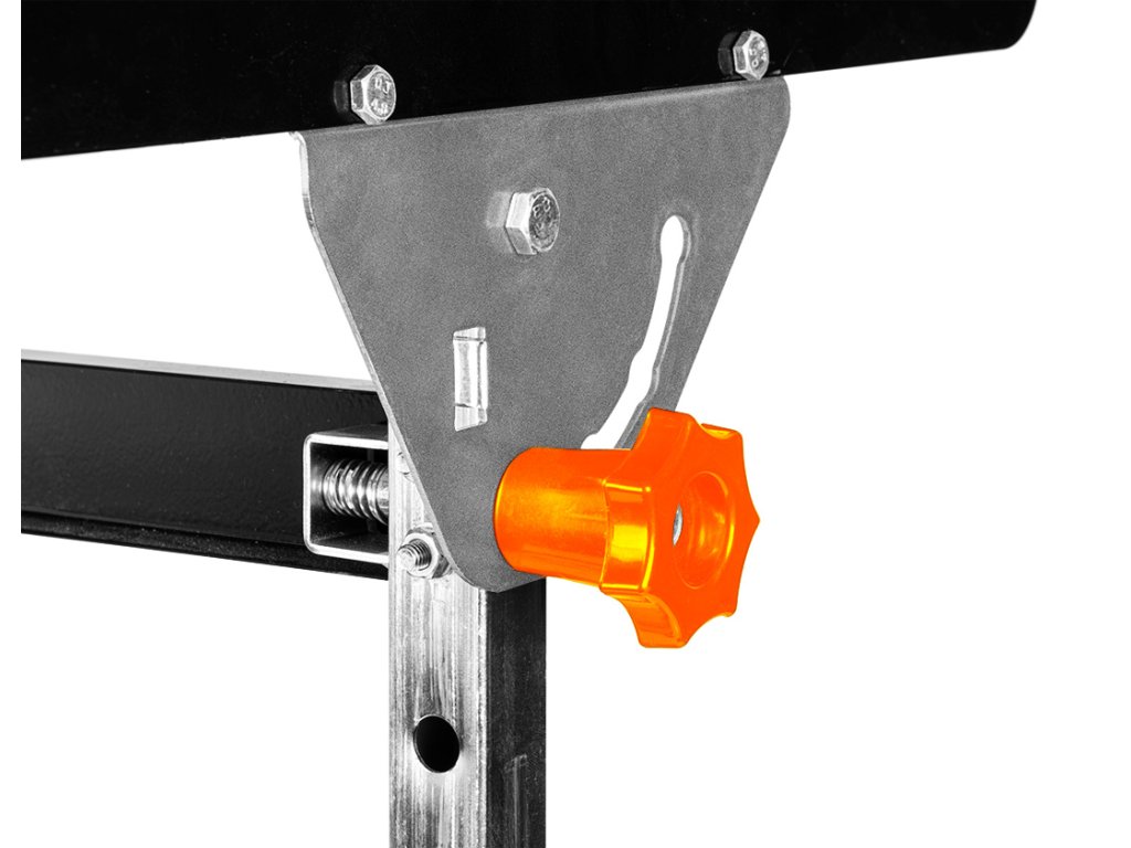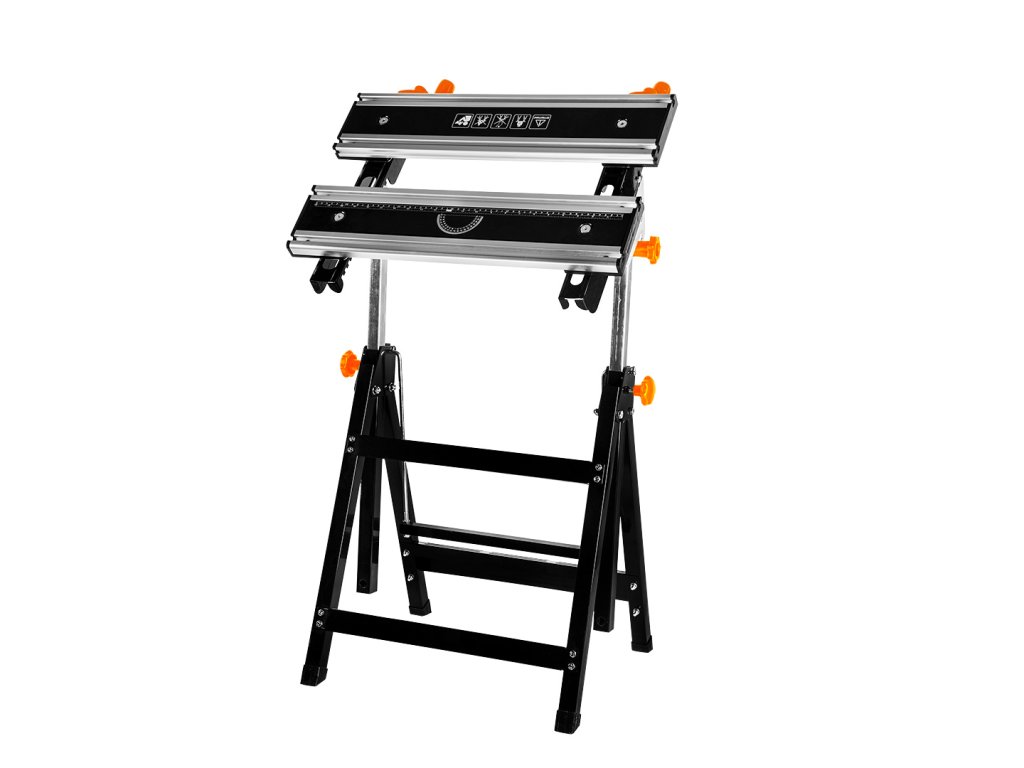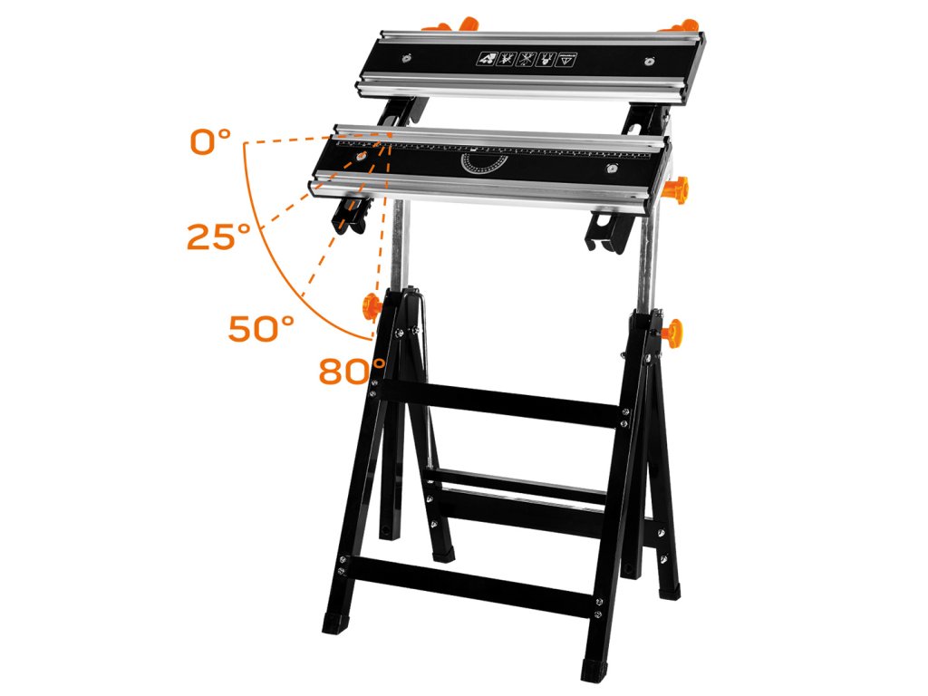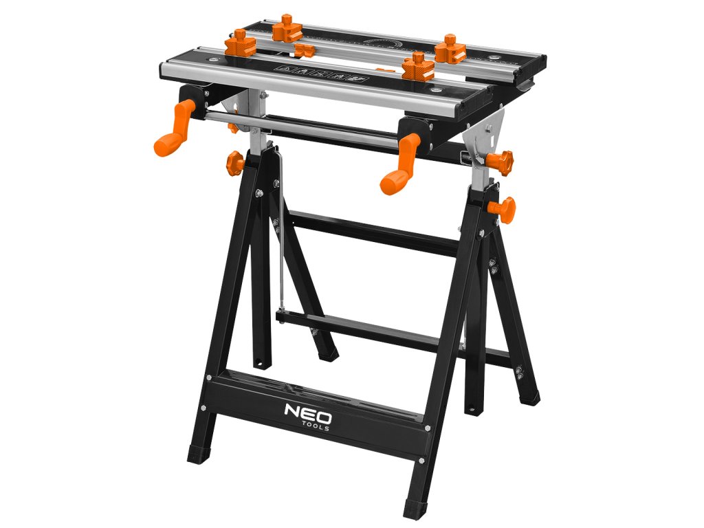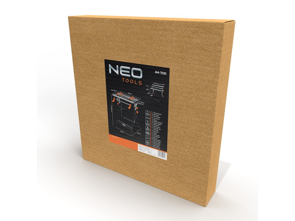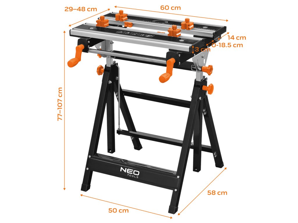 Nastaviteľný pracovný stôl, hliník 60 x 59 x (77-107) cm 44-700 od spoločnosti NEO vybavený doskou so 7-polohovým nastavením výšky 77-107 cm, nastavením šírky a 4-polohovým uhlom sklonu (0°, 25°, 50°, 80°). Vyrobený z ocele s hliníkovými profilmi a povrchovou úpravou práškovou farbou. Vystužený kovovými skrutkami, ktoré vedú pohyblivú časť hornej časti. Plastová rukoväť uľahčuje polohovanie stola. Má kompaktné rozmery v zloženom stave (60 x 29 x 77 cm). Má maximálnu nosnosť 100 kg. Ponúka sa so 4 plastovými upínacími čeľusťami a otočným kľúčom. Odporúča sa do dielní pre domácich majstrov a profesionálov.