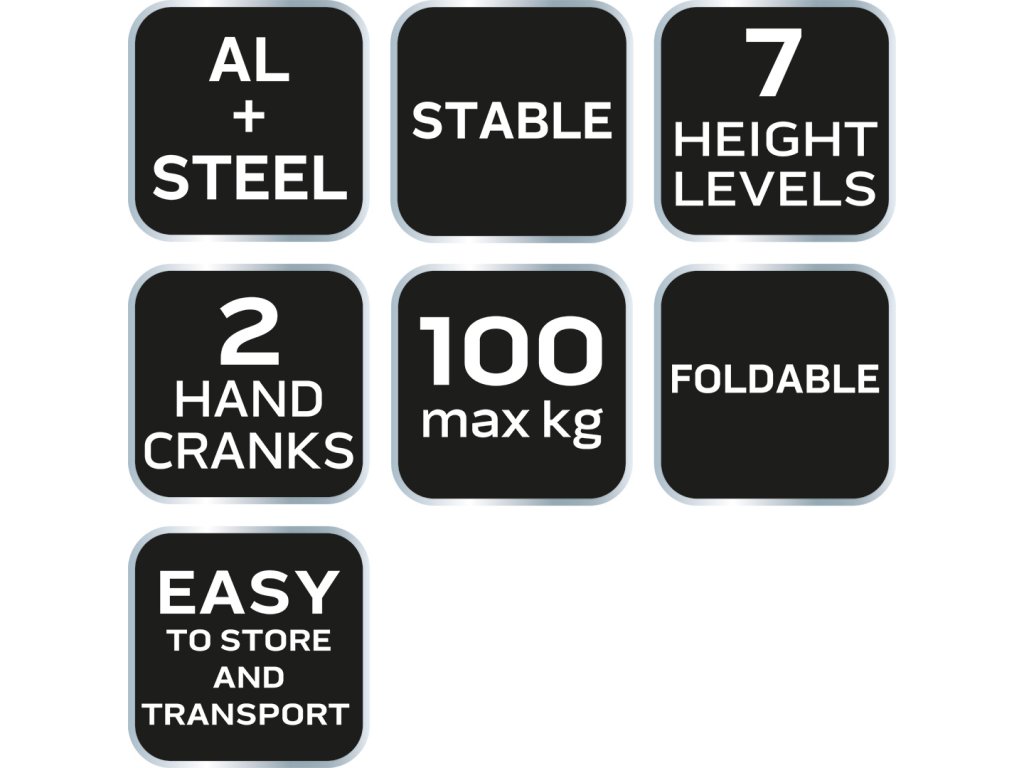 Nastaviteľný hliníkový pracovný stôl 60 x 59 x (77-107) cm, horná časť so 7-polohovým nastavením výšky 77-107 cm, nastavením šírky a 4-polohovým nastavením uhla (0°, 25°, 50°, 80°). Vyrobený z ocele s hliníkovými profilmi a povrchovou úpravou práškovou farbou. Spevnené kovovými skrutkami, ktoré vedú pohyblivú časť hornej časti. Plastová rukoväť uľahčuje polohovanie stola. Má kompaktné rozmery v zloženom stave 60 x 29 x 77 cm. Maximálne zaťaženie 100 kg. Dodáva sa so 4 plastovými upínacími čeľusťami a otočným kľúčom.