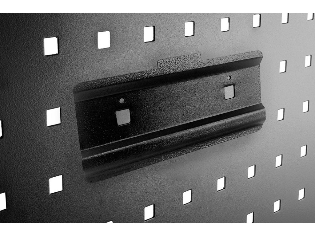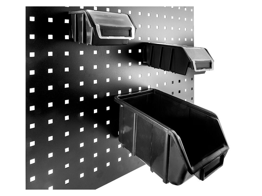 Veľký hák na úložné boxy pre steny na náradie. Je kompatibilný s kovovými nástennými panelmi. Používa sa na zavesenie skladovacích nádob pre steny na náradie. Háky sú pevne vyrobené z odolnej ocele SPCC s hrúbkou 1mm, čo poskytuje vysokú nosnosť pre boxy na náradie.