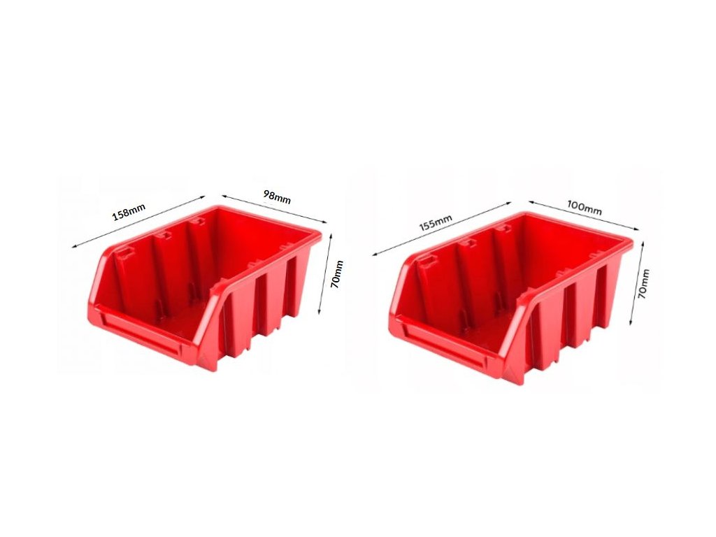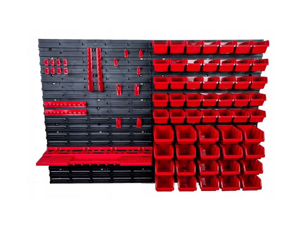 Úložné boxy: Táto stena na náradie je vybavená aj úložnými boxami. Vďaka ich využitiu bude vždy zachovaný poriadok v práci. Súčiastky od seba jednoducho a efektívne odlíšite pomocou štítkov, pre ktoré majú boxy vyhradené miesto na prednej strane. Zostava obsahuje 55 ks boxov červenej farby.