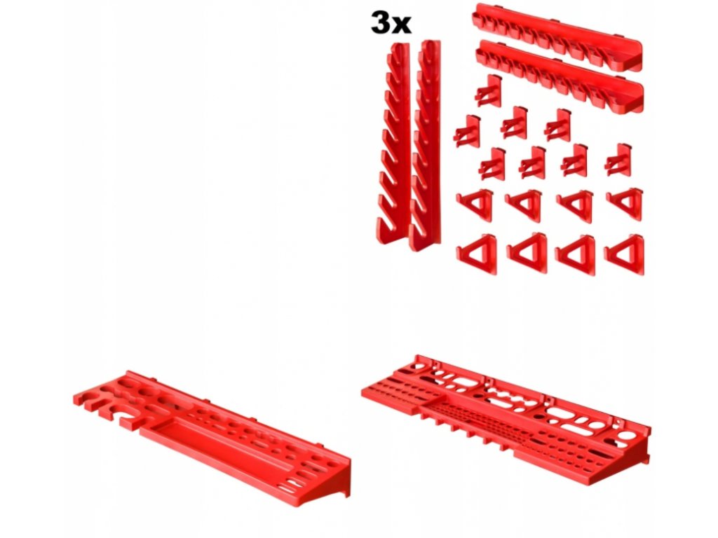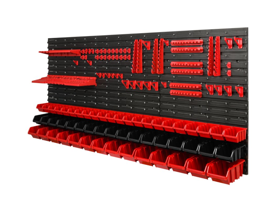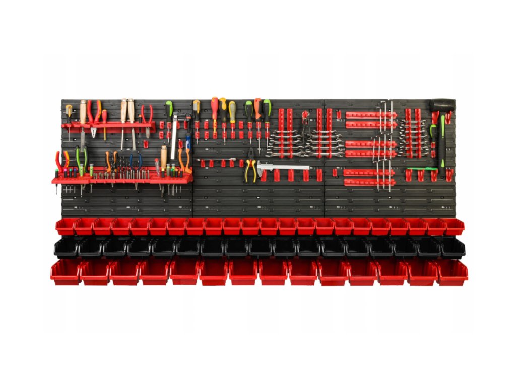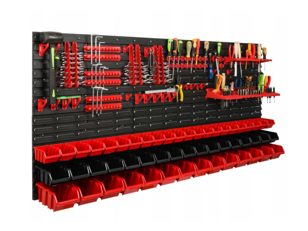 Stena o rozmere 1728 x 780mm poskytne dostatok priestoru na uloženie potrebného náradia, 53 prídavných boxov poslúži ako úložný priestor na skrutky, klince, matice alebo rôzne náhradné diely. Modulárna štruktúra dosiek umožňuje ľubovoľné usporiadanie dosiek, držiakov a boxov. Boxy, police a držiaky je možné usporiadať podľa svojej preferencie.