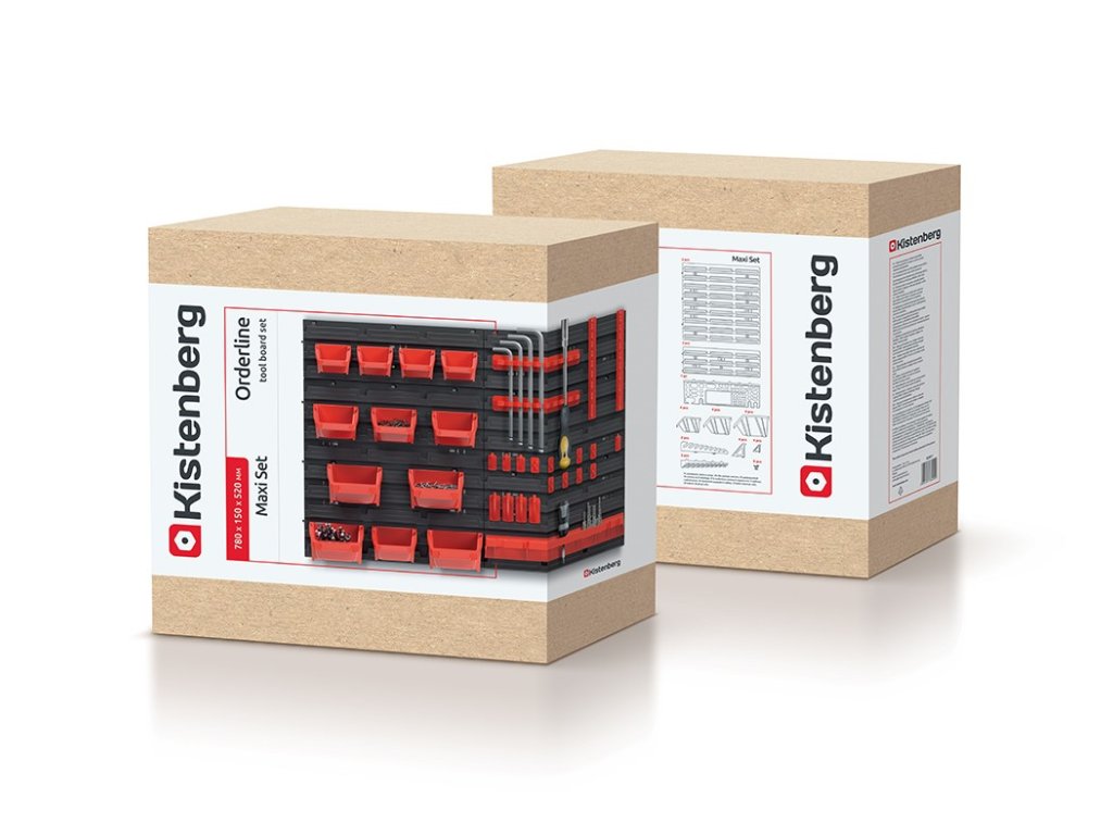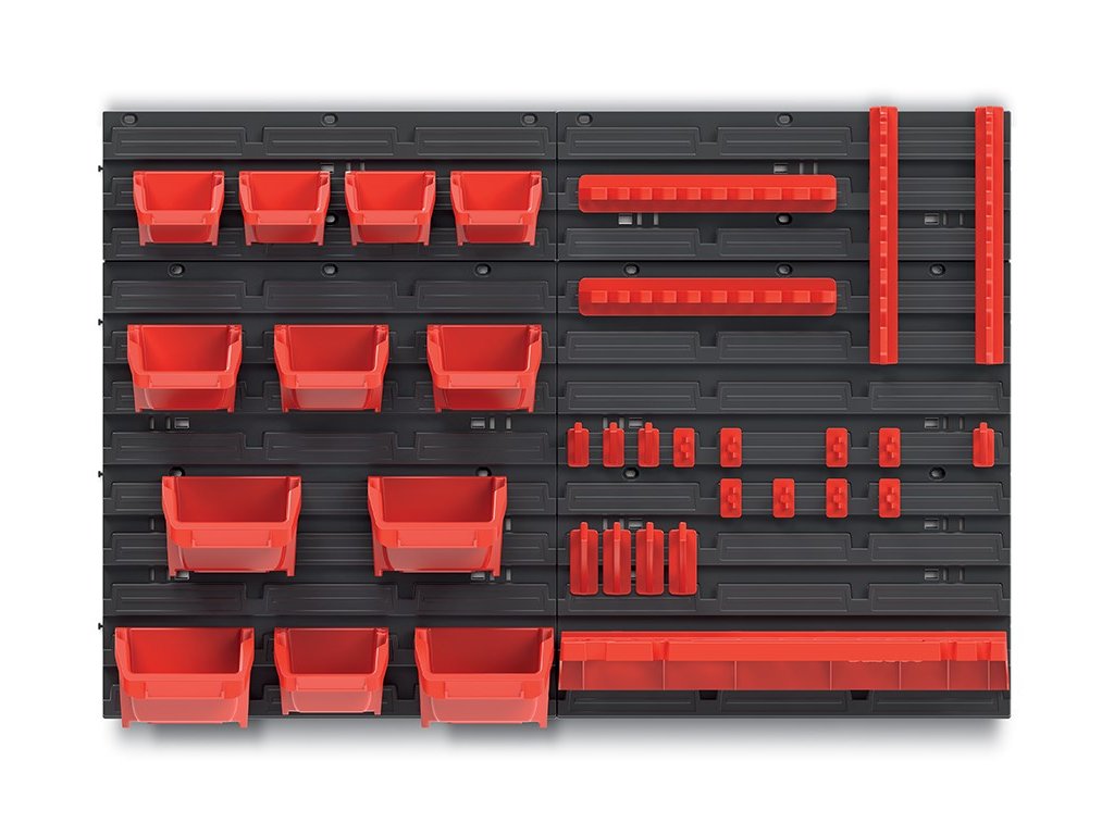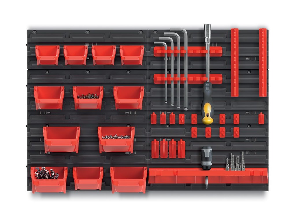 Stena o rozmere 78 x 52 cm poskytne dostatok priestoru na uloženie potrebného náradia, 12 prídavných boxov a 20 držiakov poslúži ako úložný priestor na náradie, skrutky, klince, matice alebo rôzne náhradné diely.